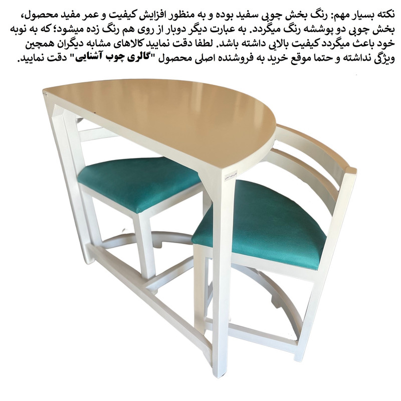 | سایر توضیحات | دو پوششه بودن رنگ سفید.| رنگ بخش چوبی این کار سفید بوده، تنوع رنگ انتخابی شما مربوط به رنگ پارچه صندلی ها می باشد. |درجه بندی کیفیت : نجاری و رنگ آمیزی عالی و بسیار مقرون به صرفه.| فروشنده اصلی این محصول برند گالری چوب آشنایی بوده و در هنگام خرید به این موضوع توجه فرمایید و کیفیت اصلی این محصول رو از همین فروشنده تهیه نمایید| ممکن است به دلیل نور عکاسی رنگها تفاوت جزئی داشته باشد.| دارای موجهای شکیل و زیبا(بدلیل طرح اصلی چوب).| به مشخصات دقیق محصول دقت کرده و توجه کنید محصول با مشخصات ذکر شده را فقط گالری چوب آشنایی ارائه مینماید.| نماهایی که در دید نیستند، به رنگ اصلی چوب است. |