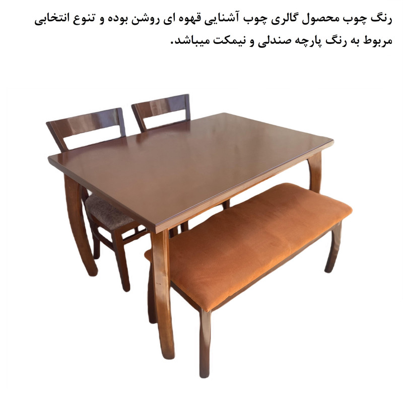 | سایر توضیحات | رنگ چوب قهوه ای روشن بوده و ثابت است تنوع رنگ انتخابی شما مربوط به رنگ پارچه صندلی ها می باشد. | درجه بندی کیفیت : رنگ آمیزی و نجاری عالی و مقرون به صرفه | فروشنده اصلی این محصول برند گالری چوب آشنایی بوده، در هنگام خرید به این موضوع توجه فرمایید.| نماهایی که در دید نیستند، رنگ اصلی چوب است. | به مشخصات دقیق محصول دقت کرده و توجه کنید محصول با مشخصات ذکر شده را فقط گالری چوب آشنایی ارائه مینماید. | ممکن است بدلیل عکاسی تفاوت جزئی در رنگها باشد.| چوب روسی(نراد) |