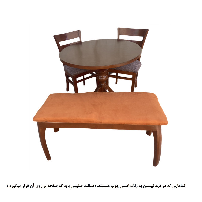 | توضیحات صندلی | نیمکت مناسب دو نفره، رنگ بخش چوبی فندقی و ثابت میباشد. | تنوع رنگ انتخابی شما مربوط به رنگ پارچه صندلی ها می باشد. | جنس پارچه استفاده شده مسکو خارجی می باشد | ارتفاع صندلی از زمین تا نشیمن حدود 45 سانتی متر است ارتفاع کل صندلی(از زمین تا بالاترین قسمت پشتی) حدود 90 سانتی متر نشیمن فوق العاده راحت جنس زیر کار صندلی اسفنج (ابر) |