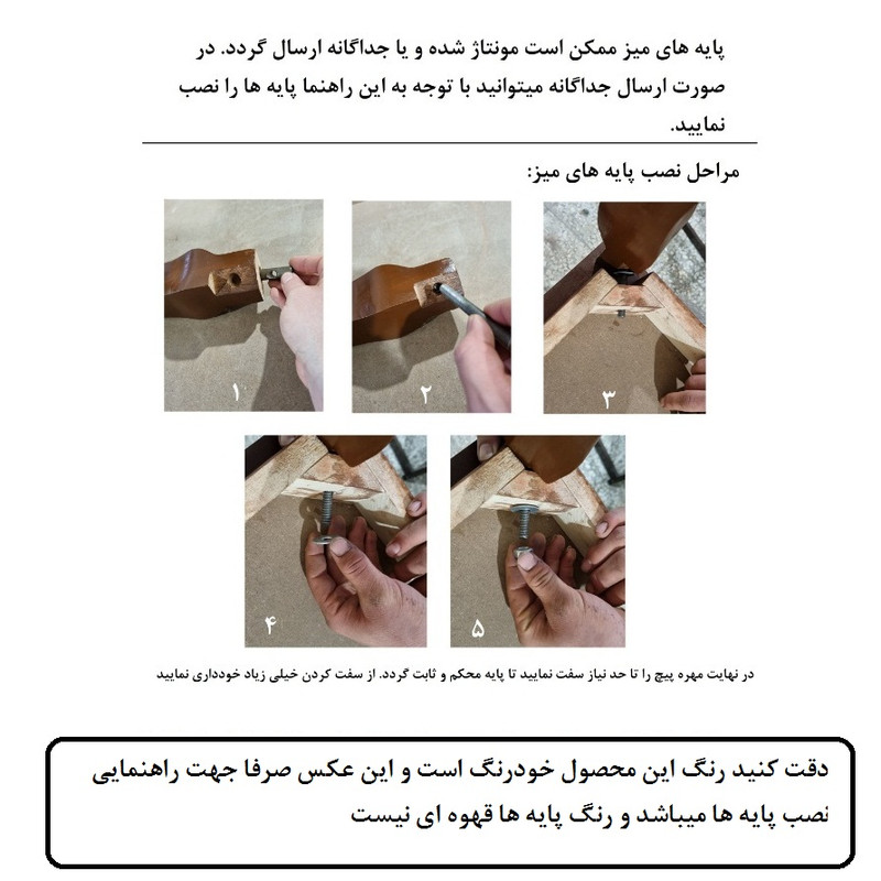 توضیحات میزابعاد میز: 120 در 80 سانتیمتر .| ضخامت چوب در پایه های نسبت به کارهای مشابه بالا هست.| ابعاد حدودی است.| دارای اتصالات بسیار محکم.| پایه های میز به صورت پیچی بوده و برای راحتی در حمل به صورت جدا ارسال میگردد که به همراه پیچ ها موجود قابل نصب میباشد.