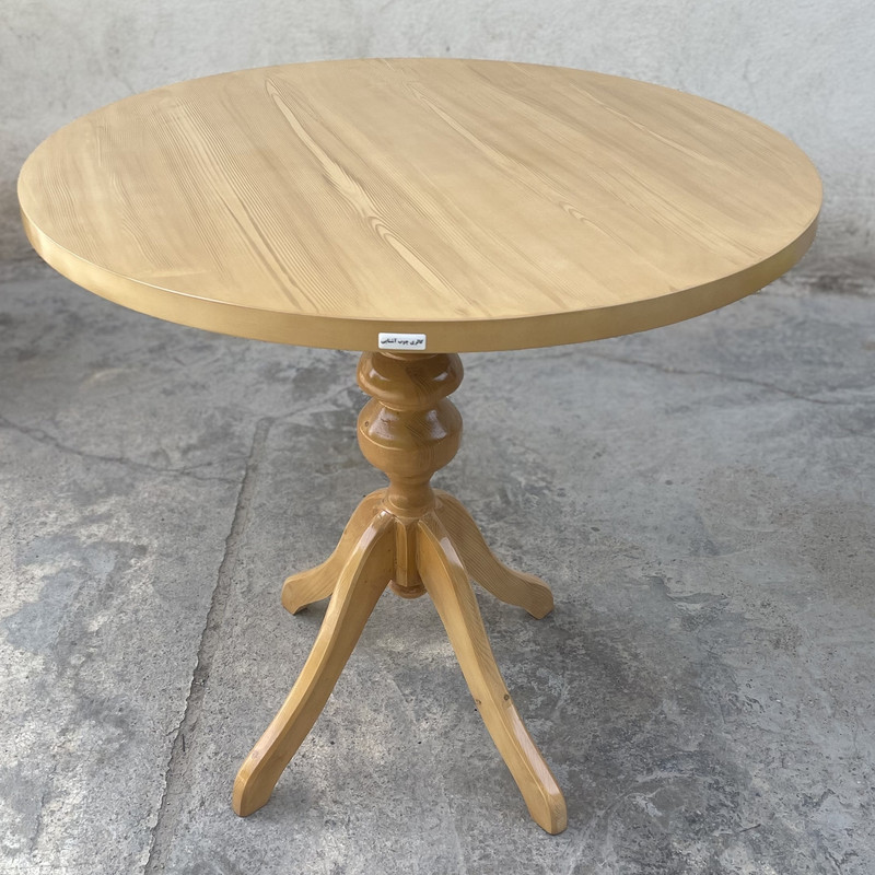 | توضیحات میز | قطر صفحه میز حدود ۹۰ دارای صفحه موجدار شکیل و زیبا.| اتصالات بسیار محکم در پایه میز نماهایی که در دید نیستند، به رنگ اصلی چوب است.(همانندصلیبی پایه میز که صفحه بر روی آن قرار میگیرد) |