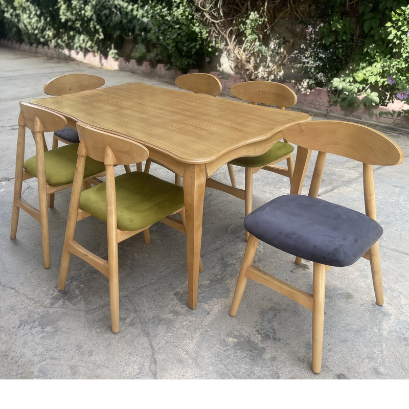 | سایر توضیحات | رنگ بخش چوبی خودرنگ بوده و ثابت میباشد. | تنوع رنگ انتخابی شما مربوط به رنگ پارچه صندلی ها می باشد. | درجه بندی کیفیت : رنگ آمیزی و نجاری عالی و مقرون به صرفه .| نماهایی که در دید نیستند، رنگ اصلی چوب است(همانند ته پایه های میز که از زیر به میز مونتاژ میشود) | ابعاد در حد 3الی4 سانتیمتر ممکن است خطا داشته باشد.| ممکن است موج صفحه متفاوت باشد.| امکان دارد برخی نقاط صفحه موجها برجسته باشد.| ممکن است در هر سری تولید، رنگ چوب بدلیل ساخت دستی رنگ تفاوت جزئی داشته باشد.| به مشخصات دقیق محصول دقت کنید. | ممکن است بدلیل عکاسی تفاوت جزئی در رنگها باشد.| |