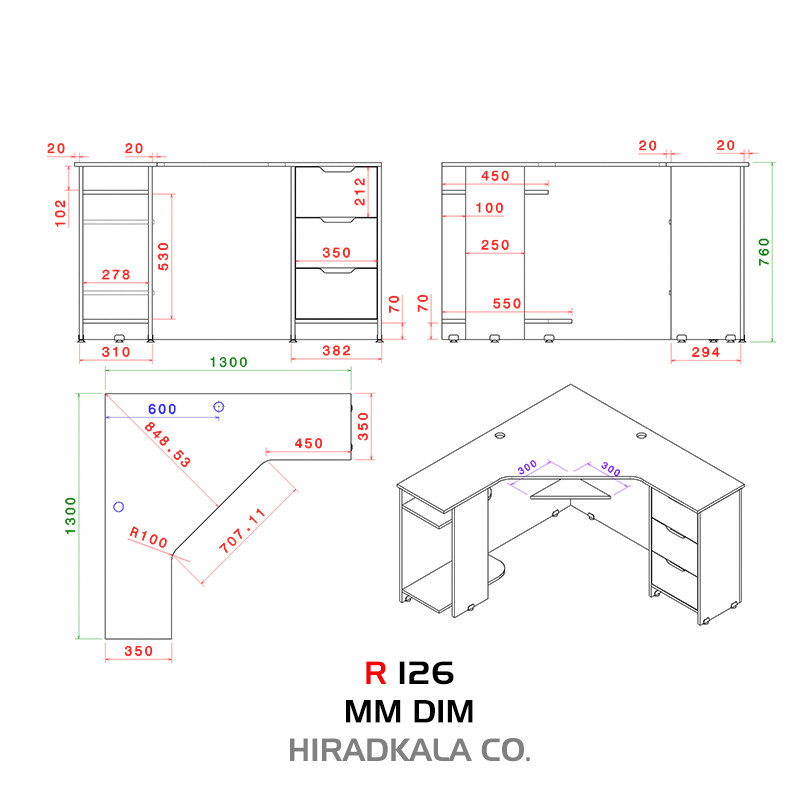 میز کامپیوتر هیراد مدل R126 با ظاهری ساده و زیبا، میزی کارآمد و مناسب جهت اتاق منزل و یا محیط کار شماست. همچنین این میز بعنوان میز کامپیوتر و گیمینگ قابل استفاده می باشد. با توجه به سادگی ظاهر، قابل ست شدن با انواع دکوراسیون در منزل می باشد. این محصول مناسب کامپیوتر های دسکتاپ و لپتاپ است. طراحی این محصول به سبک مدرن می باشد و به عنوان میز سایبر یا مانیتورینگ هم قابل استفاده می باشد و با توجه به طراحی R126 شما می توانید چند مانیتور را در کنار هم قرار دهید و یا از مانیتور های خمیده استفاده کنید و غرق در لذت و کار شوید. همانطور که از طراحی R126 پیداست برای پر کردن فضای کنج اتاق طراحی شده تا بتوانید علاوه بر حفظ زیبایی، فضای بیشتری در اتاق خود داشته باشید. میز کامپیوتر هیراد مدل R126 از مقاومت بالایی برخوردار بوده و می توانید برای استفاده طولانی مدت به راحتی روی آن حساب باز کنید. میز کامپیوتر هیراد مدل R126 با رنگ بندی دلخواه شما تولید خواهد شد.جنس محصول ام دی اف می باشد.