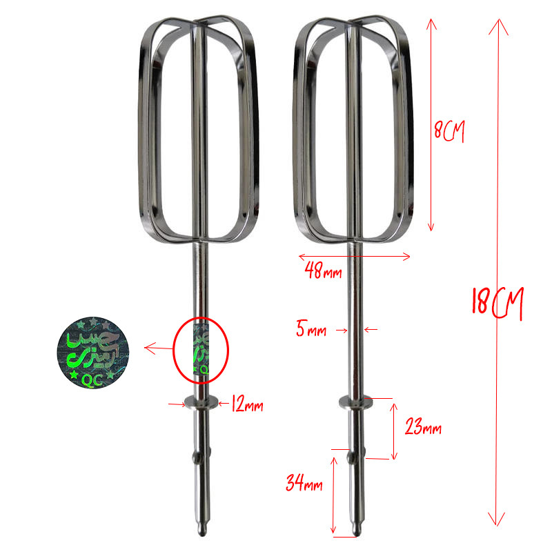 این محصول شامل یک جفت میله تخت (شاخک , پره) همزن با ابعاد 5x5x18 سانتیمتر مناسب برای اکثر همزن ها از قبیل (کاتامو, سانی, فیلیپس و... در صورت داشتن میله با این ابعاد) می باشد.