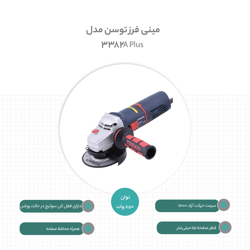 سنباده و برش فلزات کاری است که اگر با ابزارهای دستی همچون سوهان و کمان‌اره انجام شود بسیار زمان‌بر و خسته‌کننده می‌شود. حتی گاهی نمی‌توان از این ابزارها برای انجام برش‌کاری یا سنباده‌زنی استفاده کرد. به‌عنوان اگر بخواهیم جای قرار گرفتن زبانه‌ی قفل را در چهارچوب فلزی درب خالی کنیم و از ابزار دستی استفاده کنیم باید قلم و چکش را به کار بگیریم. اما می‌توان برش و سنباده‌کاری فلزات را با دستگاهی به نام "فرز" به‌راحتی و با سرعت بالاتر انجام داد. فرزها در دو سایز بزرگ و مینی ساخته‌شده و دارای قدرت‌ها و قابلیت‌های مختلفی هستند. با قرار دادن صفحه مخصوص روی این دستگاه می‌توان برشکاری یا سنباده‌کاری را روی اجسام انجام داد. از دستگاه فرز بزرگ نمی‌توان در فضاهای کوچک و برای دقت‌های بالا استفاده نمود. مینی فرزها در این مواقع کاربرد بهتری دارند و کار با آن‌ها نسبت به فرز بزرگ، راحت‌تر است و در اصطلاح خوش‌دست‌تر هستند. در مورد مینی فرز، ذکر این نکته بسیار مهم است که نباید ساعت‌های طولانی به‌صورت مداوم از آن استفاده کرد زیرا موجب خرابی و سوخت موتور دستگاه خواهد شد. مدل 3382 A یک مینی فرز است که توسط شرکت Tosan با ابعاد 12.5 × 15.5 × 40.5 سانتی‌متر و وزن 2.3 کیلوگرم تولیدشده است. این دستگاه باقدرت 850 وات یک مینی فرز قوی به شمار می‌آید و گیربکس آن مجهز به سیستم قفل‌کن جهت سهولت در تعویض صفحه دستگاه است. قطر صفحه قابل‌نصب روی مینی فرزها، 115 میلی‌متر و برای سایش و برش روی اجسام به گونه‌های مختلفی تولید شده‌اند. سوییچ کشویی روی دستگاه جهت قفل کردن شستی و روشن ماندن دستگاه است. شرکت توسان این مینی فرز را به‌صورت ارگونومیک تولید و در اختیار کاربر قرار داده است.