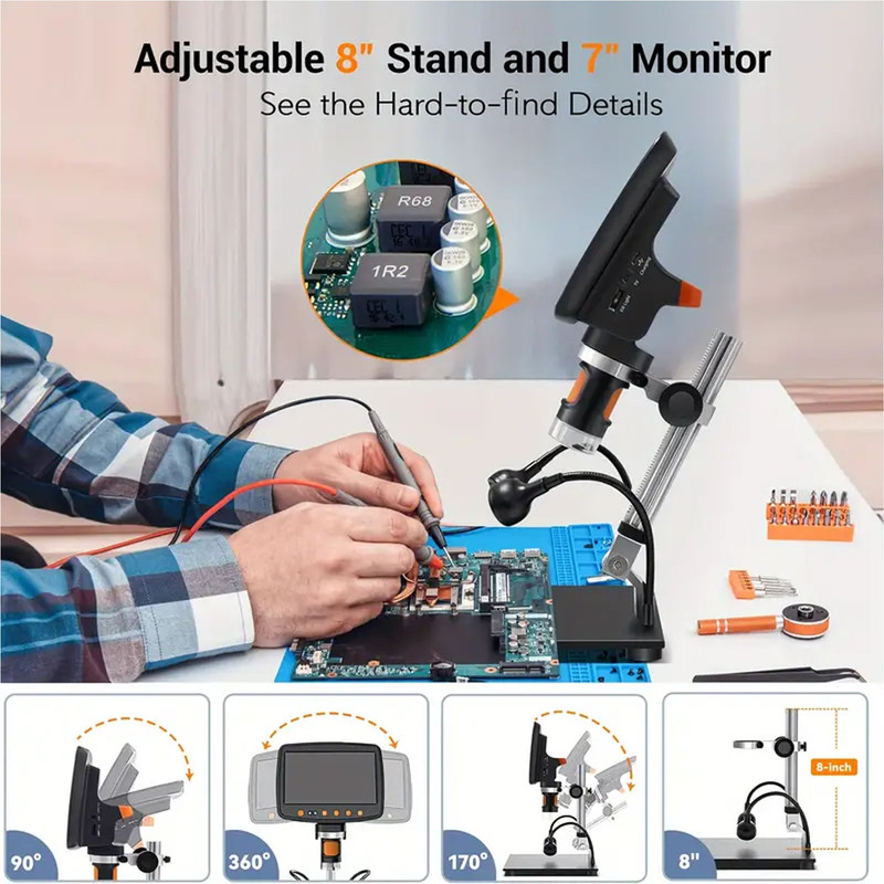 میکروسکوپ و لوپ دیجیتال مدل MS1 مجهز به صفحه نمایشگر با کیفیت HD با قابلیت چرخش ۳۶۰ درجه است. مانند شکل زیر پایه اتصال نمایشگر قابلیت خم شدن به میزان ۹۰ درجه به عقب را دارد که امکانی عالی در زمان کار را فراهم می‌کند و در بررسی‌های طولانی مدت مانع از درد در کمر و گردن آزمایشگر می‌شود. علاوه بر این خروجی HDMI امکان اتصال میکروسکوپ به نمایشگرهای دیجیتال(تلویرسون دیجیتال) بزرگ را فراهم می‌کند تا بتوانید در صورت نیاز مشاهدات و بررسی‌های خود را در مقیاسی بسیار بزرگ انجام دهید.میکروسکوپ و لوپ دیجیتال مدل MS1 با بزرگنمایی ۵۰ تا ۱۰۰۰ برابر با سه منبه نوری تصاویری با رنگ‌های طبیعی و جزپیاتی دقیق اراپه می‌دهد. منبع نور اصلی با ۸ لامپ ال.ای.دی بعلاوه دو منبع نوری به صورت دو بازوی متحرک و قابل تنظیم به مقدار لازم به نمونه‌های آزمایشی نور می‌دهند تا تصاویر میکروسکوپ دارای جزئیات و شفافیت قابل قبولی باشند.در این میکروسکوپ تصویر از انعکاس نور از روی نمونه تشکیل می‌شود، بنابراین نیاز به آماده‌سازی قبلی ندارید و می‌توانید از مدار الکتریکی گرفته تا گیاه وحشرات یا هر چیزی را زیر لنز آن قرار داده و آنرا بررسی نمایید. این ویدئو میکروسکوپ یا لوپ دیجیتال امکان استفاده هم‌زمان چندین نفر از یک میکروسکوپ را فراهم می‌کند در نتیجه مناسب مدارس و یا محیط‌های آموزشی است.ابزاری ایده‌آل برای مراکز تعمیر کامپیوتر(لپ تاپ)،ساعت، جواهرسازی،بررسی دقیق مدارچاپی ، بردهای الکتریکی (موبایل، کامپیوتر و ...)صنایع نساجی.صنایع چاپ.تحقیق و پژوهش و کنترل کیفیت واحدهای تولیدی. تعمیر موبایل و قطعات الکترونیکی است. همچنین مناسب کارگاه‌های مونتاژ قطعات الکترونیکی و کنترل کیفیت. علاوه بر آن به دلیل قیمت ارزان و قابلیت‌های متنوع، مناسب منازل و افراد علاقه‌مند به شناخت اجسام مختلف و جهان میکروسکوپی است.