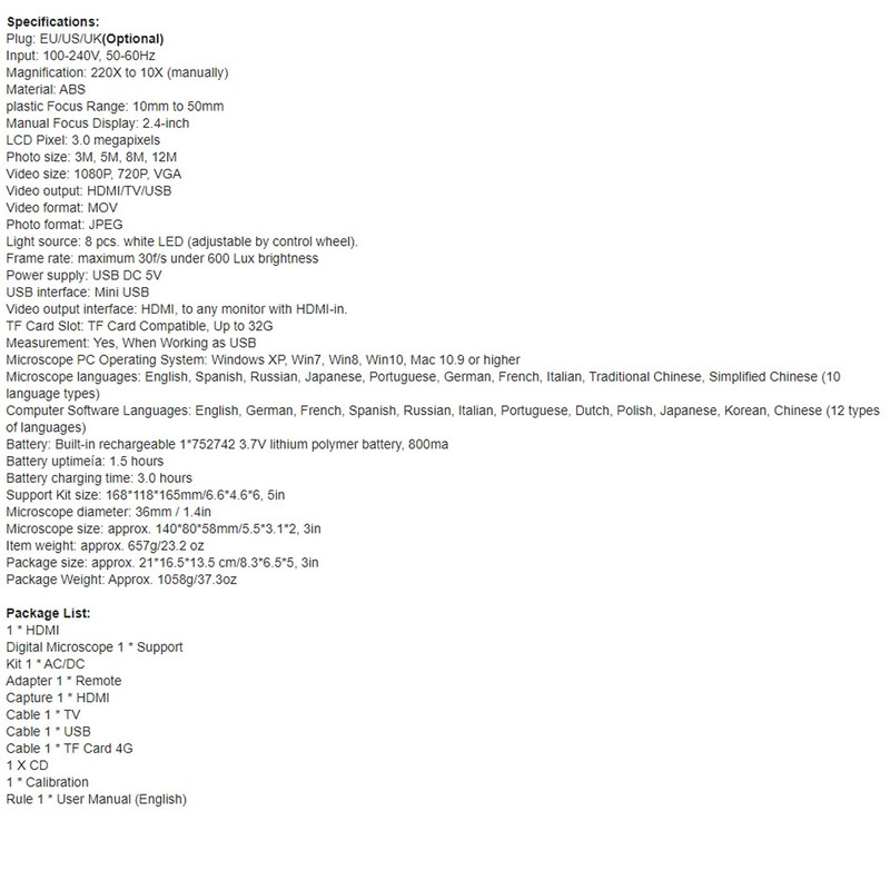 میکروسکوپ و لوپ دیجیتال مدل 10-220X توان بزرگنمایی تا 220 برابر را دارد و مجهز به صفحه نمایش HD به اندازه 2.4 اینچ (6 سانتیمتر) و دوربینی قدرتمند است که میتواند با کیفیت 12 مگاپیکسل از نمونهها عکس بگیرد و با کیفیت Full HD یا همان 1080 فیلمبرداری کند. منبع نور آن را 8 عدد LED با قابلیت تنظیم شدت روشنایی تأمین میکند، در نتیجه تصاویری روشن با کنتراست خوب را فراهم میکند.میکروسکوپ و لوپ دیجیتال مدل 10-220X باتری لیتیومی دارد که پس از 2 ساعت شارژ کامل قابلیت کار مداوم تا 1.5 ساعت را دارد. صفحه نمایش محصول فوق از کارتهای حافظه Micro SD پشتیبانی نموده و میتوان تصاویر بزرگنمایی شده را با نصب این کارتها ذخیره نمود.قابل اتصال مستقیم با کابل HDMI به تلویزیون است تا بتوانید تصاویر را با کیفیت بالا در تلویزیونهای بزرگ ببینید. علاوه بر این با کابل USB قابل اتصال به لپتاپ و کامپیوتر است و میتوانید از طریق کامپیوتر نمونهها را بررسی و اندازهگذاری کرده و یا تصاویر دلخواه را ضبط کنید.