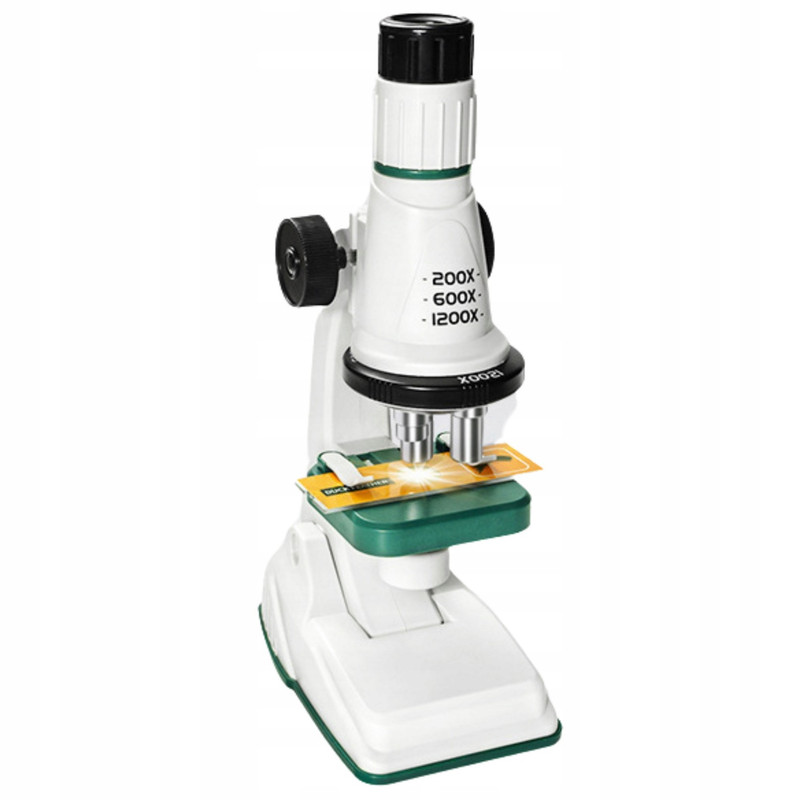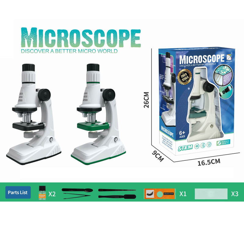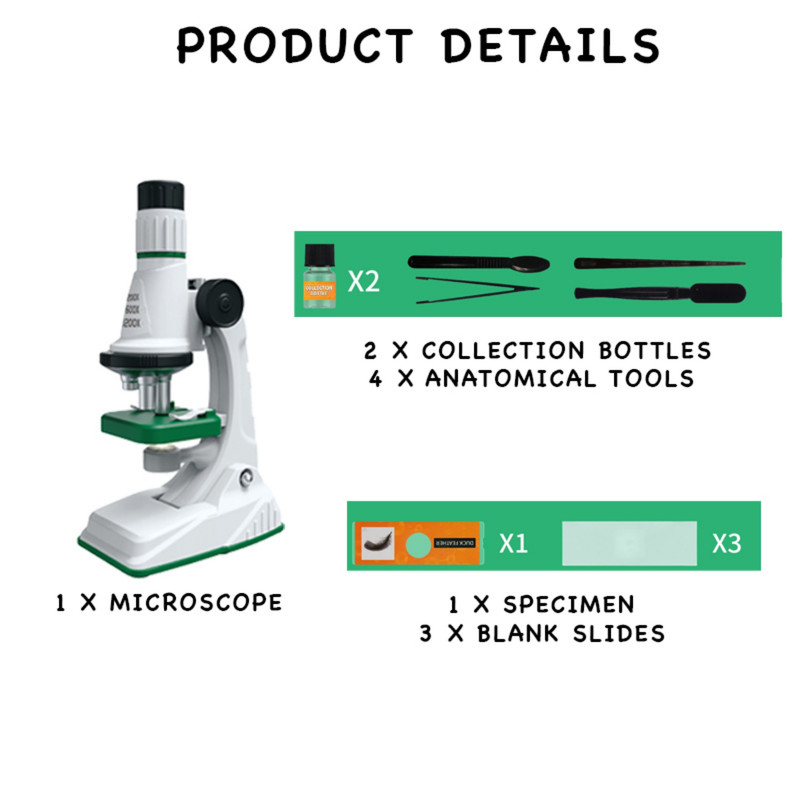 کیت کامل میکروسکوپ محتوی یک عدد میکروسکوپ، چهار عدد لام آزمایشگاهی، دو عدد مخزن پلاستیکی نگهداری باکتری و جمع آوری نمونه و یک عدد پنس (انبر) ، سه عدد قاشق و کاردک و سوزن می باشد . این میکروسکوپ دارای نور برای مشاهده بهتر و دقیق تر، دکمه روشن خاموش کردن نور میکروسکوپ، شاسی تنظیم نور دستگاه (به صورت آسانسوری، حرکت در ارتفاع)، شاسی زوم دستگاه وهمچنین دارای 3 سر متحرک با قابلیت های بزرگنمایی متفاوت (200x 600x 1200x) و قابلیت حرکت پایه می باشد. برای راه اندازی دستگاه به 2 عدد باتری قلمی نیاز است.
