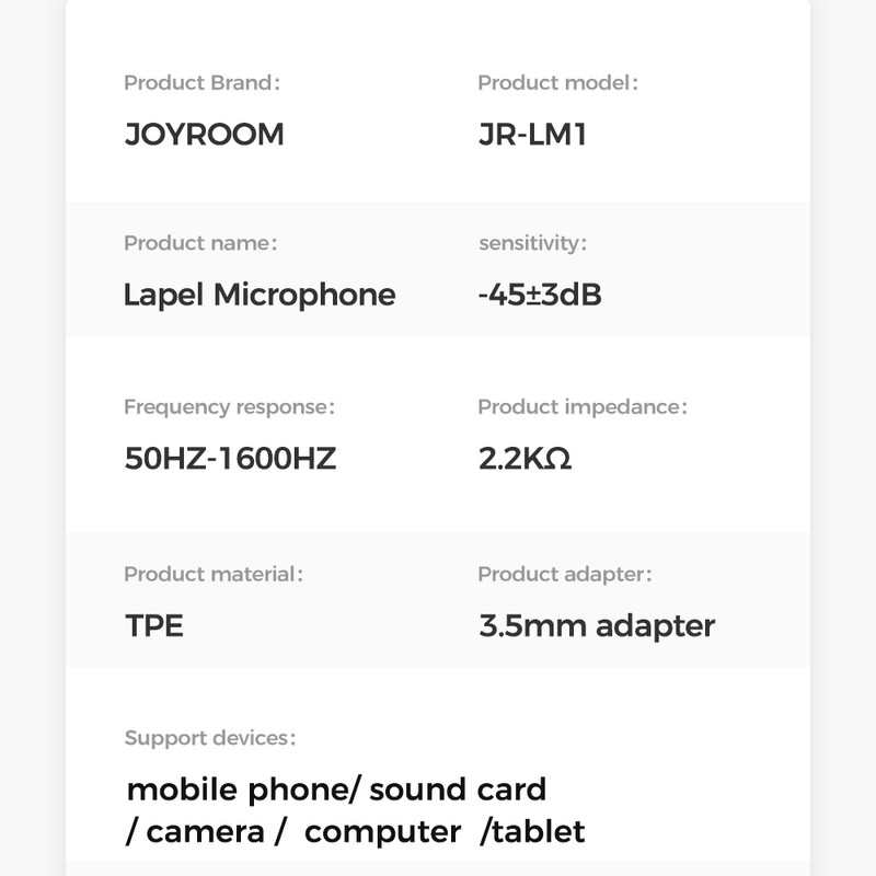 میکروفون سیم دار جویروم JR-LM1 با اکثر گوشیهای موبایل، تبلتها، کامپیوترها، کارت های صدا و دوربین ها سازگاری دارد و از قابلیت Multi Device نیز پشتیبانی میکند.