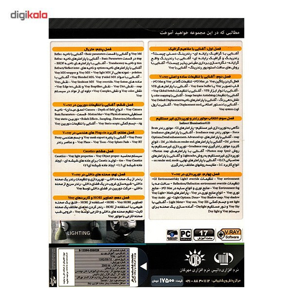 | سایر توضیحات | - بسته حاوی 2 حلقه دیویدی با 17 ساعت آموزش - مجموعه آموزشی چندرسانهای فنی مهندسی - آموزش جامع V Ray در سطوح مقدماتی و پیشرفته - حجم نرم افزار 2300 مگابایت - قابل نصب بر روی سیستم عامل 7 - حداقل مشخصات بستر سخت افزاری P4 |