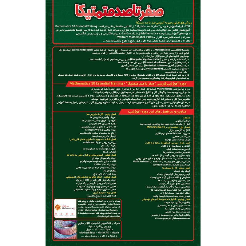 | سایر توضیحات | دارای قفل نرم افزاری و قابل فعال سازی بر روی 5 سیستم مجزا - 200 دقیقه آموزش صفر تا صد متمتیکا به زبان فارسی - آموزش پروژه محور همراه با فایل های تمرینی - برگرفته از دوره های معتبر آموزشی سطح یک جهانی - ترجمه تخصصی توسط متخصصین ایرانی - همراه با نسخه کامل نرم افزار Wolfram Mathematica v10.0.2 |