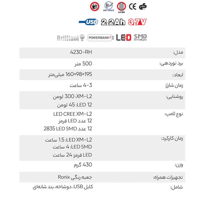 | سایر توضیحات | ابزاری چند منظوره با 3 حالت: چراغ مطالعه، SOS و نورافکن - تنظیم شدت نور با کمک کلید دو حالته جهت استفاده بهینه از دستگاه و بهبود عملکرد باتری - دارای لامپ LED با تکنولوژی SMD جهت ایجاد بالاترین حد روشنایی - روشنایی فوق العاده تا شعاع 500 متر - بدنه ساخته شده از ABS و پلی کربن برای ایجاد بالاترین مقاومت در برابر ضربات احتمالی و وزن سبک - باتری لیتیوم 3.7 ولتی با ظرفیت 2200 میلی آمپر ساعت با کارایی بالا - مجهز به چراغ مطالعه LED با مدت زمان استفاده بیش از 10 ساعت - مجهز به فناوری SMD برای حداکثر روشنایی و طول عمر بیشتر - دارای چراغ چشمکزن قرمز (SOS) برای استفاده در حالت اضطراری - دارای نشانگر میزان شارژ و درگاه USB روکش دار - دارای بند رو دوشی برای حمل و نگهداری آسان هنگام پیاده روی یا هنگام استفاده در فضای باز - قابلیت استفاده به عنوان پاوربانک جهت شارژ موبایل و ... - قابلیت شارژ با شارژر موبایل، رایانه و تمامی منابع تغذیه |