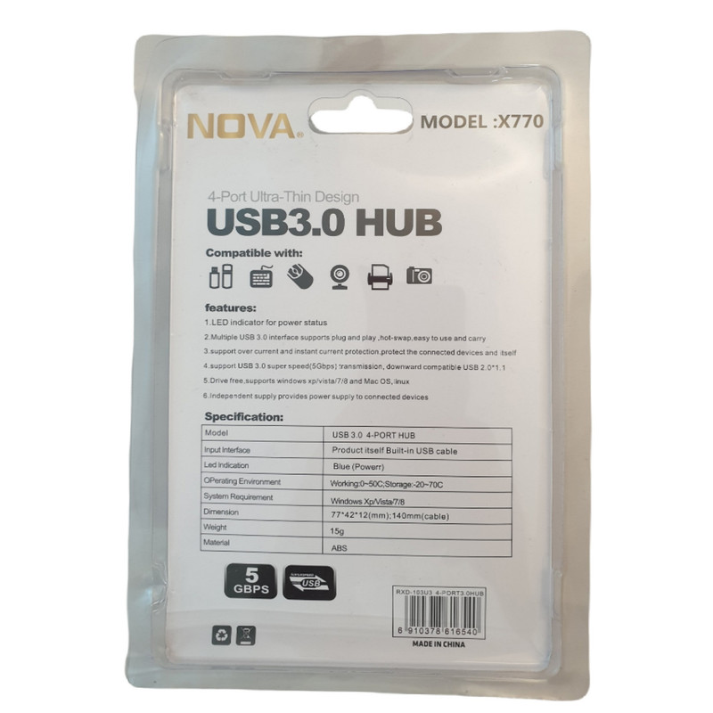 هاب برند NOVA مدل X770 دارای چهار پورت USB3.0 بوده که می تواند علاوه افزایش تعداد پورت های USB دستگاه شما، اطلاعات شما را با سرعت خیلی بیشتری نسبت به پورت های USB2.0 انتقال دهد.