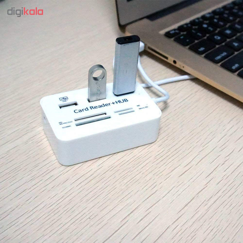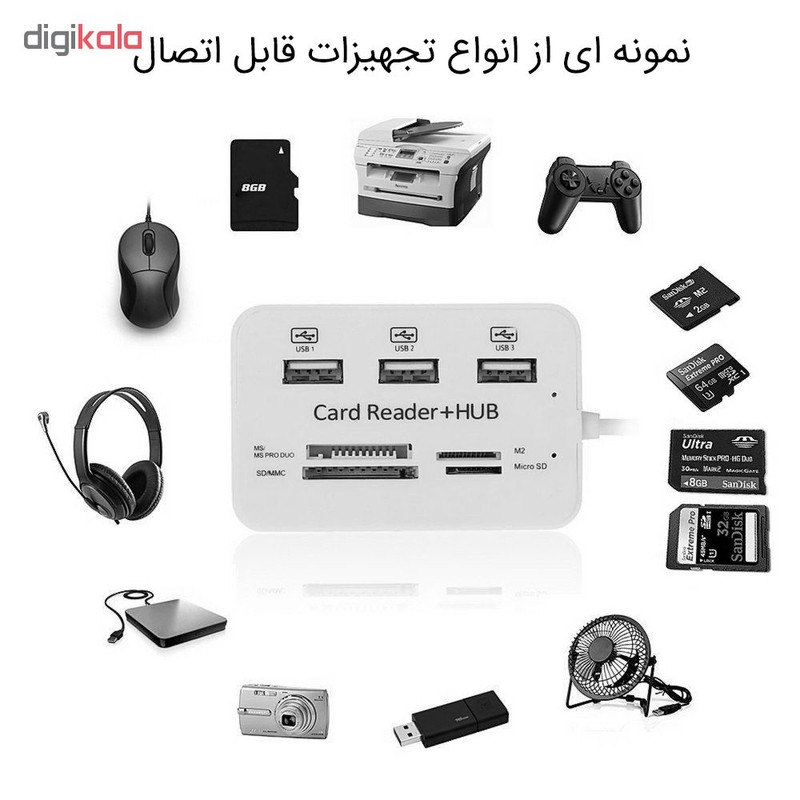 ین هاب دارای 7 پورت است که سه عدد از آنها USB 2 است و چهار شیار دیگر برای اتصال انواع مموری است . این هاب توانایی آن را دارد که دادهها را با سرعت 480 مگابایت بر ثانیه انتقال دهد. . ویژگی دیگرآن این است که سازگاربا تمام سیستمعاملهاست و همینطور شیار کارتخوان دارد و از کارتهای حافظه SD(HC), MMC, RS-MMC Micro SD, TF Flash, MS PRO, MS DUO, M2 پشتیبانی میکند. به طور کلی این هاب قابلیت خواندن اکثر مموری های موجود در بازار ایران را دارا می باشد . برای نشان دادن وضعیت این وسیله دارای یک LED کوچک است که نشان دهنده وضعیت آماده به کار بودن آن است . از دیگر قابلیت های آن امکان اتصال به آداپتور است . هنگام اتصال آداپتور حتما از آداپتور با مشخصات فنی مناسب استفاده کنید . طول سیم این دستگاه 50 سانتی متر است