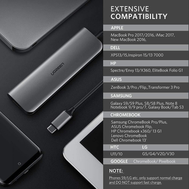 دستگاه CM136 برند یوگرین 6 پورت در 1 هاب با بدنه آلومینیومی است. این هاب دارای خروجی TYPE-C به طول 15 سانتیمتر و شامل ورودی های 3 عدد USB 3.0 با سرعت انتقال اطلاعات بالا، یک HDMI با کیفیت 4K، یک جک 3.5 میلیمتری AUX که قابلیت پشتیبانی از میکروفون را دارد و همچنین میتوان به پورت TYPE-C با قابلیت Fast Charge با توان 100 وات اشاره نمود.