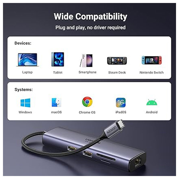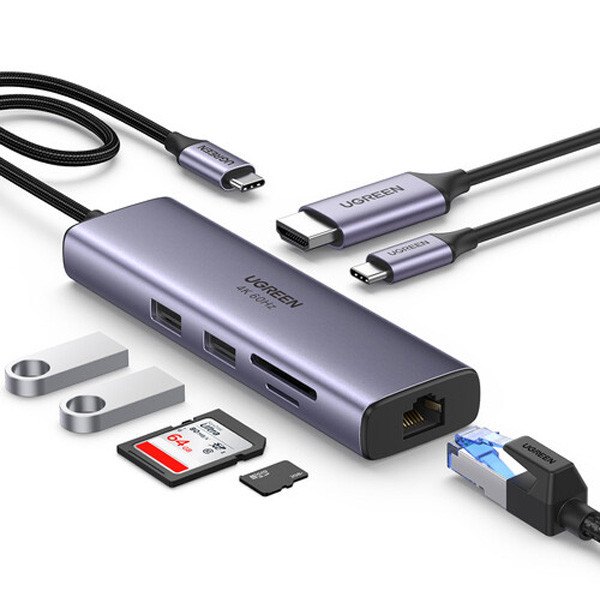 هاب 7 پورت USB-C یوگرین مدل CM512-60515، از 2 پورت USB-A ورژن USB3.0، یک پورت انتقال برق USB-C PD3.0 1000W، یک درگاه HDMI 4K@60Hz، یک درگاه RJ45 1000Mbps، یک درگاه SD card با سرعت 104MB/s و یک درگاه TF card با سرعت بالا پشتیبانی میکند، که این امکان را به کاربر می دهد به راحتی بتواند ابزارهای جانبی مختلفی مانند کیبورد ، ماوس ، دوربین، پرینتر، پاور بانک و ... خورد را متصل کند.