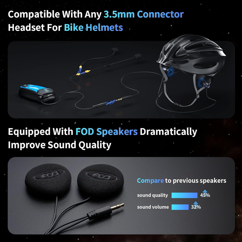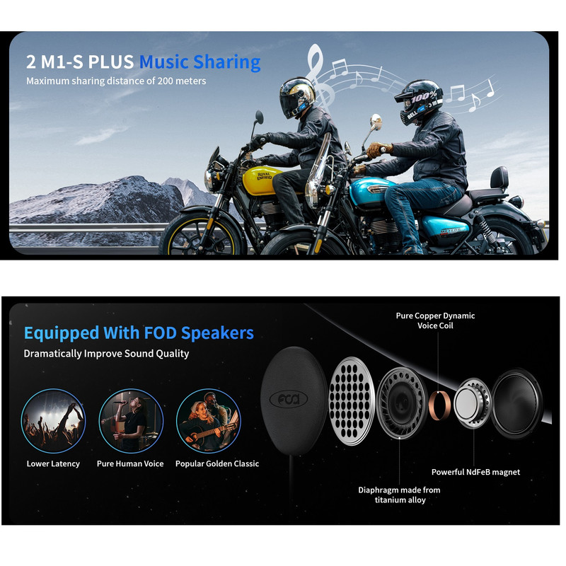 [بلندگوهای FOD HRSQS و دو M1-S PLUS برای اشتراک‌گذاری موسیقی] M1-S PLUS مجهز به بلندگوهای HRSQS سفارشی ۴۰ میلی‌متری ارتقا یافته است که توسط تیونرهای ارشد با دقت تنظیم شده‌اند تا واضح‌ترین صدا را حفظ کرده و کیفیت صدای پویاتری داشته باشند. این هدست دارای یک آداپتور استاندارد ۳.۵ میلی‌متری است که به هدفون‌های داخل گوشی با کانکتور ۳.۵ میلی‌متری معمولی تلفن همراه برای استفاده در محیط‌های بدون کلاه ایمنی، کلاه ایمنی دوچرخه‌سواری/کلاه ایمنی سوارکاری متصل می‌شود. این هدست بلوتوث موتورسیکلت همچنین از ۲ واحد M1-S PLUS برای اشتراک‌گذاری موسیقی پشتیبانی می‌کند، می‌توانید با شریک زندگی خود به یک موسیقی گوش دهید!