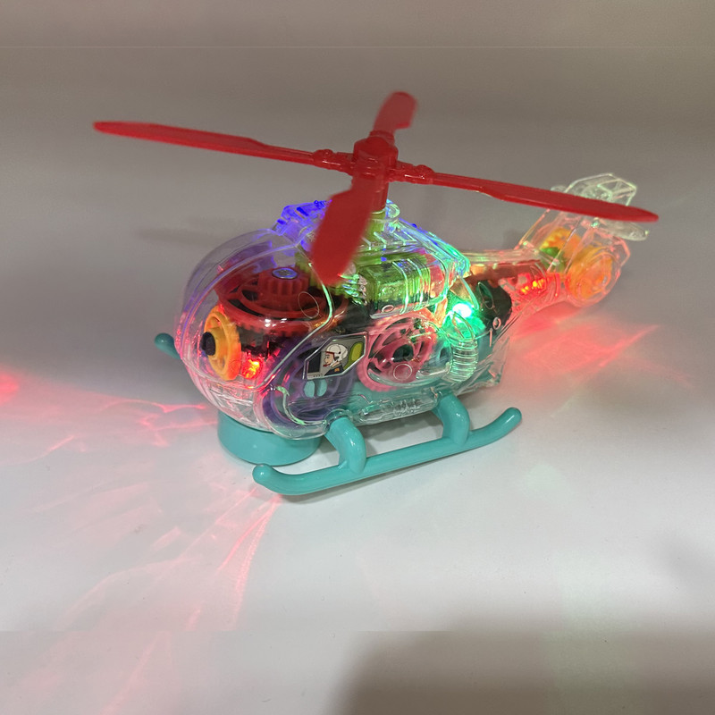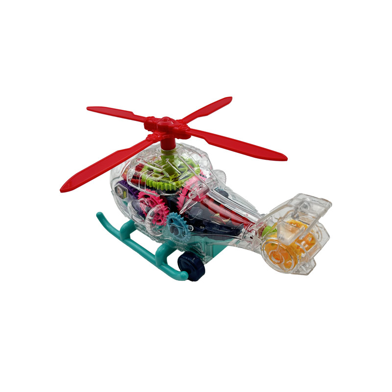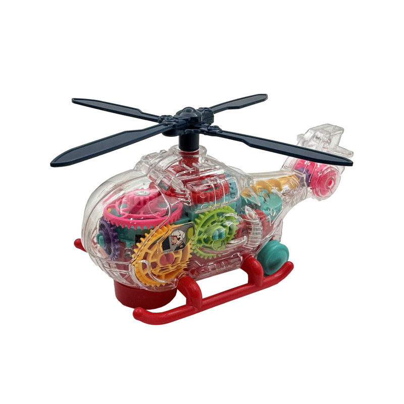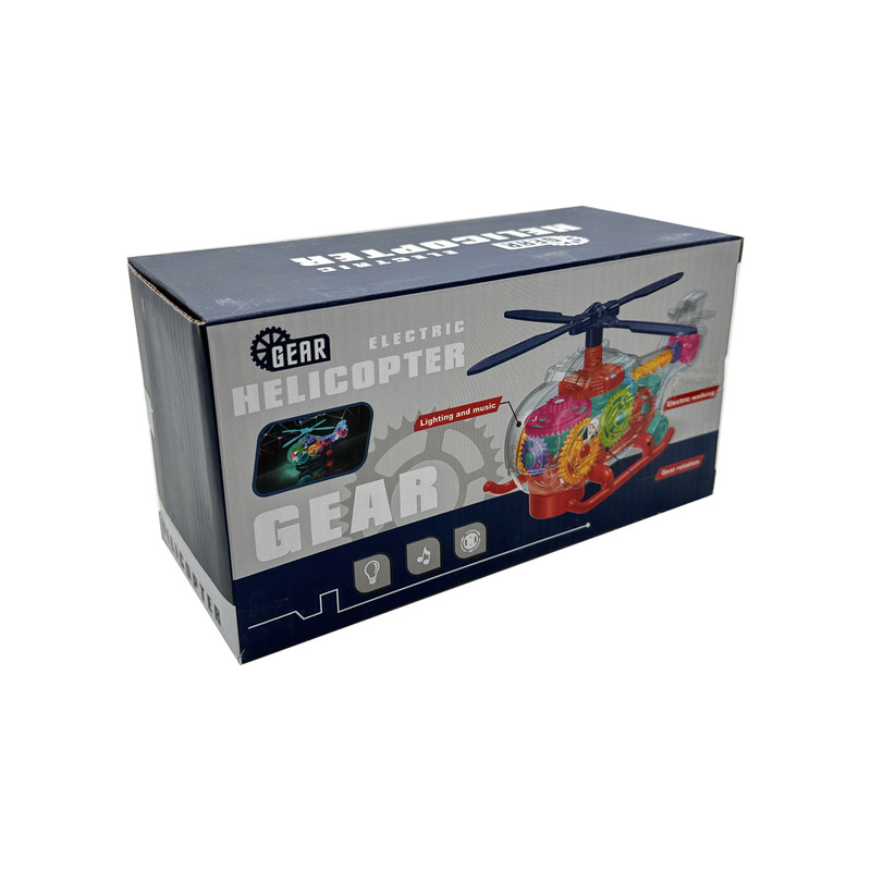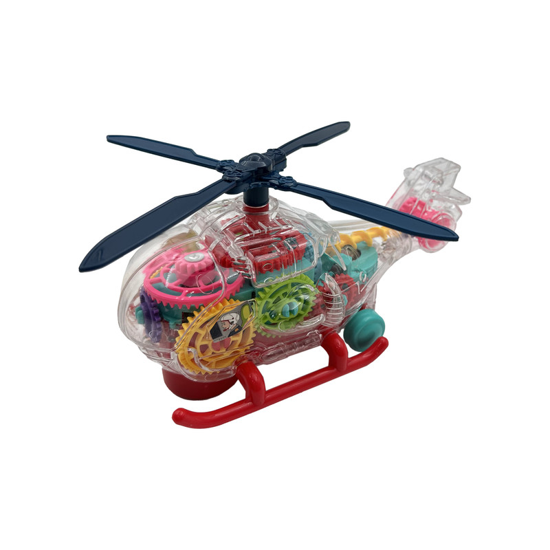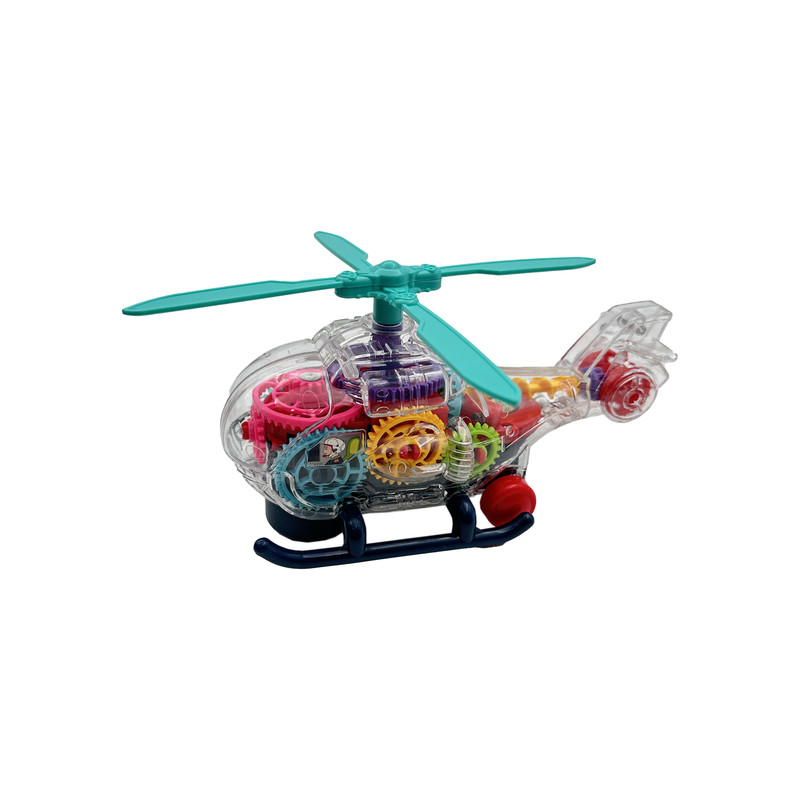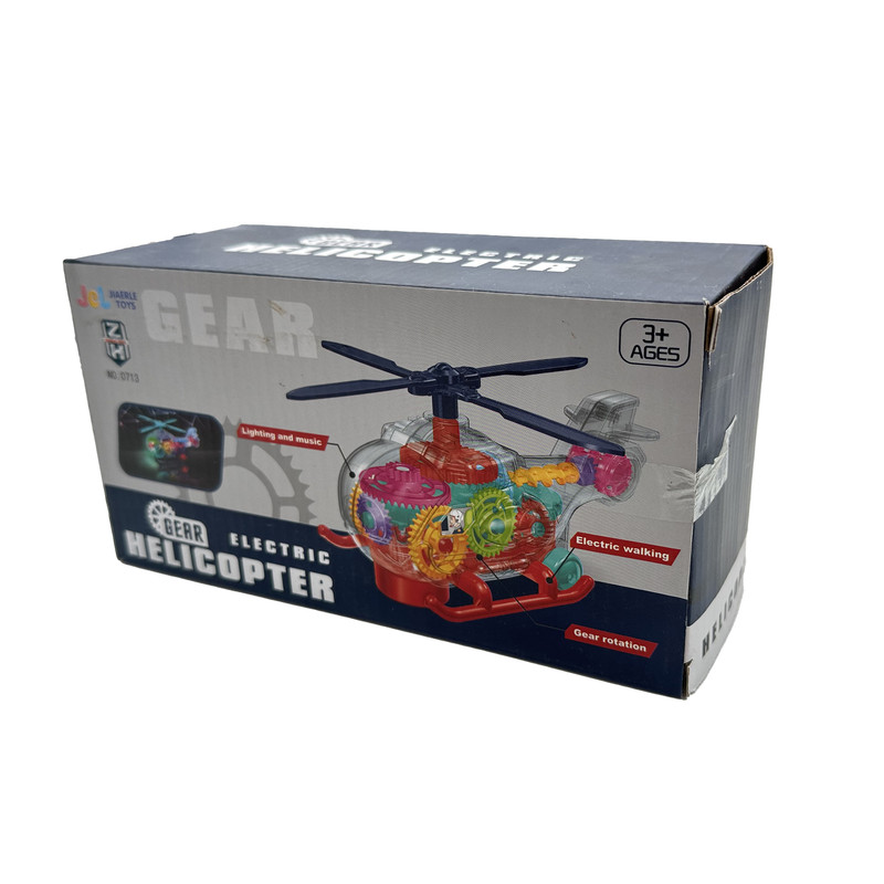 اسباب بازی هلی کوپتر چرخدنده ای یک وسیله بازی باطری خور می باشد. این اسباب بازی که با 3 عدد باطری قلمی کار میکند دارای دکمه روشن و خاموش بوده که با روشن شدن به حرکت درآمده و با برخورد به موانع تغییر مسیر داده و همچنین چرخدنده های داخل آن شروع به حرکت می نماید.