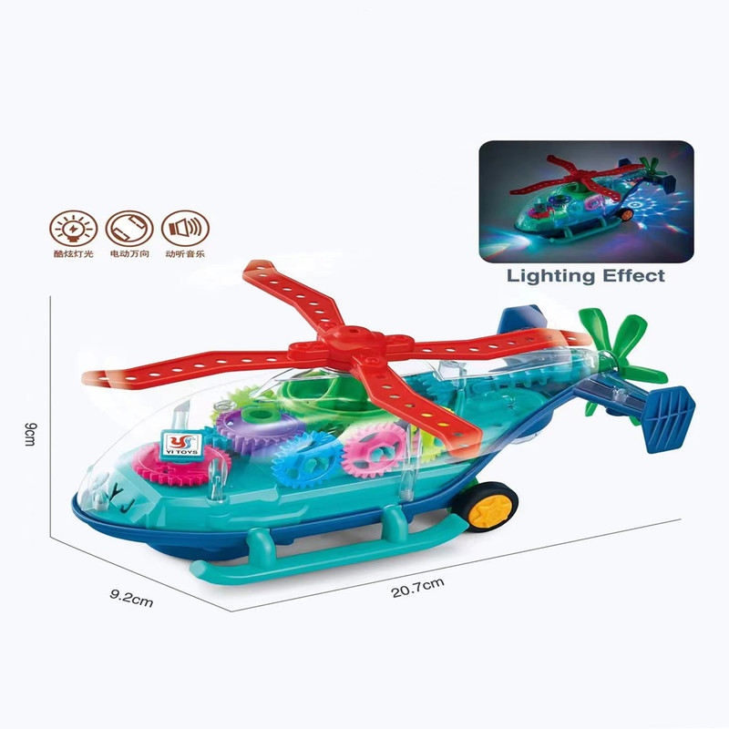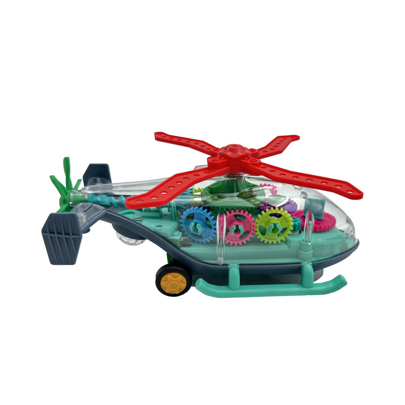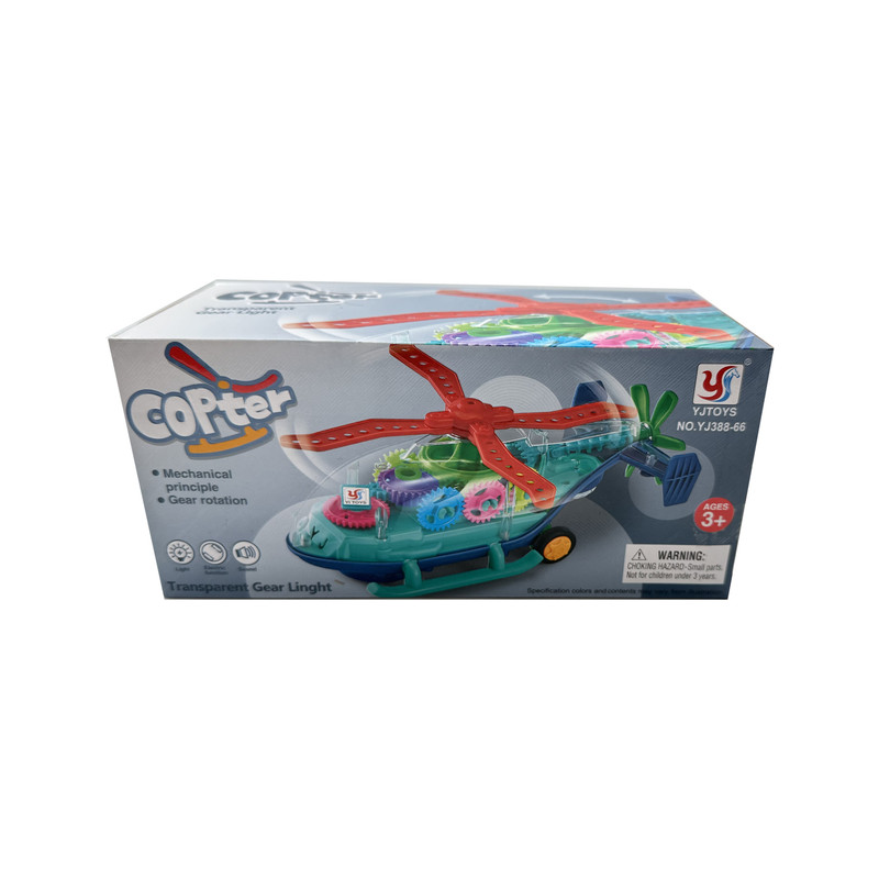 اسباب بازی هلی کوپتر چرخدنده ای یک وسیله بازی باطری خور می باشد. این اسباب بازی که با 3 عدد باطری قلمی کار میکند دارای دکمه روشن و خاموش بوده که با روشن شدن به حرکت درآمده و با برخورد به موانع تغییر مسیر داده و همچنین چرخدنده های داخل آن شروع به حرکت می نماید.