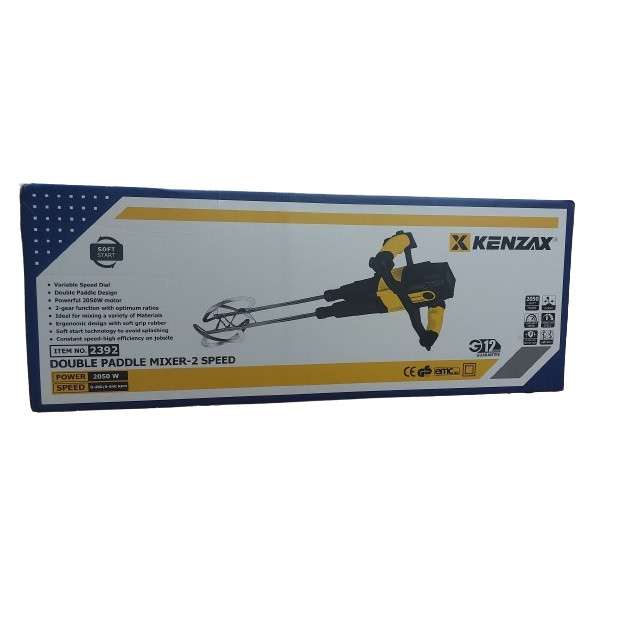 ميکسر دو محور 2050 وات 2392 دارای موتور 2050 وات با ولتاژ 220 ولت می باشد. وزن این میکسر صنعتی 7.6 کیلوگرم و ابعاد دو تیغه این همزن 100x570 میلی متر است و حداکثر حجم اختلاط آن 120 لیتر می باشد. بر روی دستگاه نصب می باشد. تیغه دوبل P1 این تیغه کاربرد چند منظوره داشته و بدون نیاز به آچار به صورت کوپلینگی متصل می شود و مناسب کارهای سنگین و پر فشار می باشد و همچنین برای عملیات مخلوط کردن مواد چسبناک سنگین، ملات، رنگ های مقاوم در برابر حرارت و ... نیز کاربرد دارد. برای روشن ماندن دستگاه به طور پیوسته کافی است که پس از فشردن کلید و روشن شدن دستگاه، دکمه قفل کن را فشار دهید تا دستگاه در حالت روشن باقی بماند. با چرخاندن دکمه تغییر سرعت در دو دنده، می توان به سرعت آن را به 480 تا 840 دور دقیقه تغییر داد. این همزن صنعتی دارای محافظ اضافه بار و استاندارد ایمنی سافت استارت می باشد و در بسته بندی محصول یک جفت ذغال نیز موجود است.