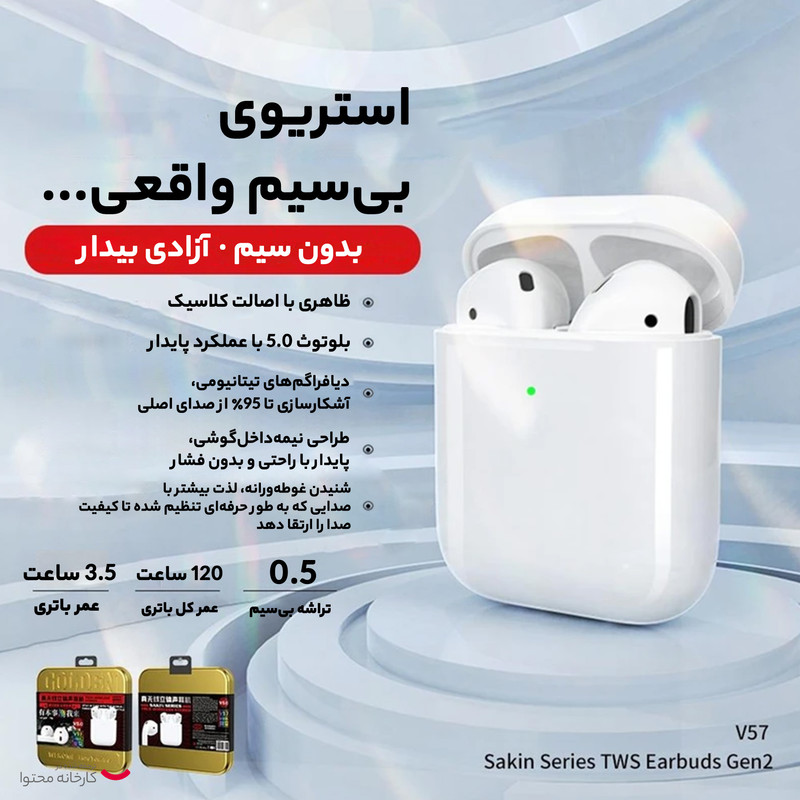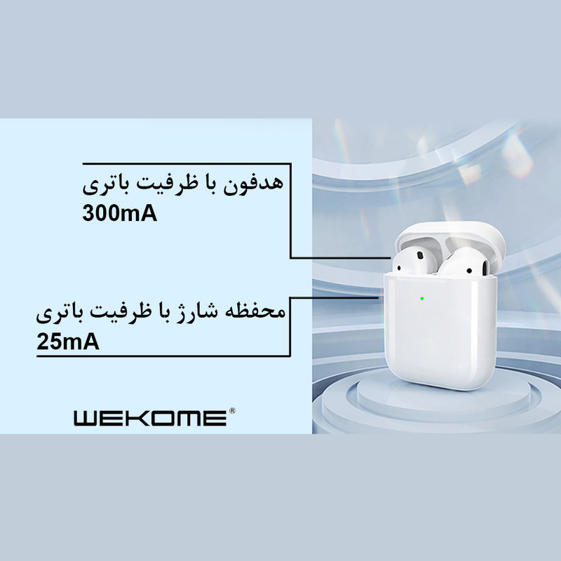 هندزفری بلوتوث مدل V57 برند WEKOME یک هندزفری بسیار توانمند از زیر مجموعه های برند محبوب Remax می باشد. طراحی و ساخت این هندزفری به لحاظ ظاهری کاملا مشابه به ایرپاد 2 اپل می باشد. این هندزفری با کیفیت از بلوتوث ورژن 5 استفاده می کند. باتری داخلی هندزفری از نوع لیتیوم با ظرفیت 25 میلی آمپر و باتری داخلی کیس شارژ آن دارای ظرفیت قابل توجه 300 میلی آمپر می باشد که میتواند میزان زمان مناسبی برای نگهدا...