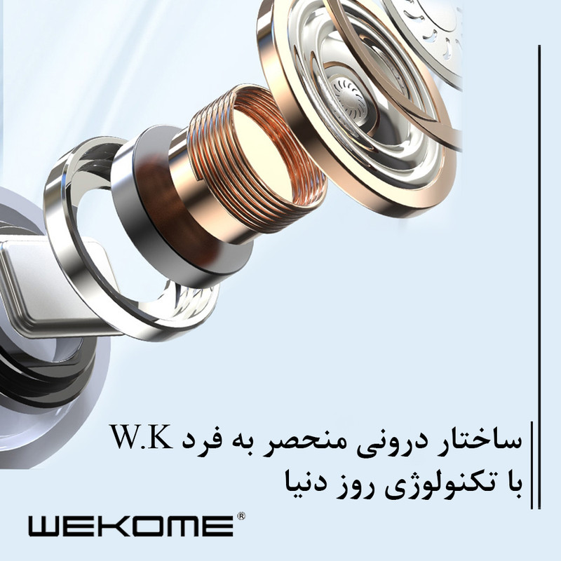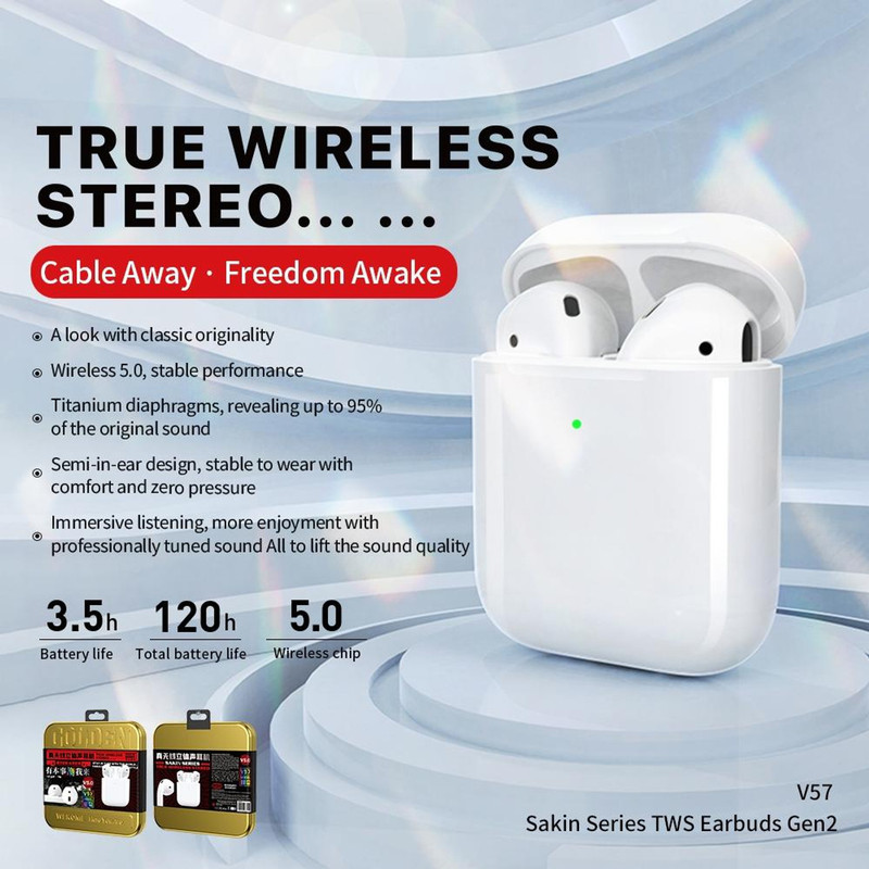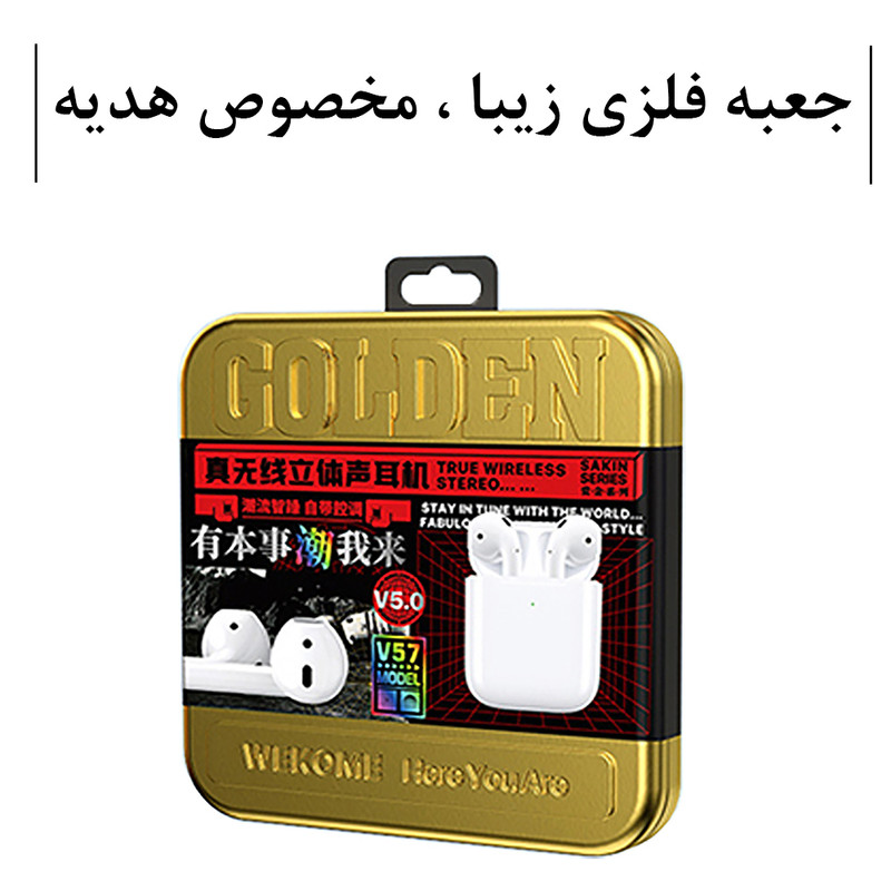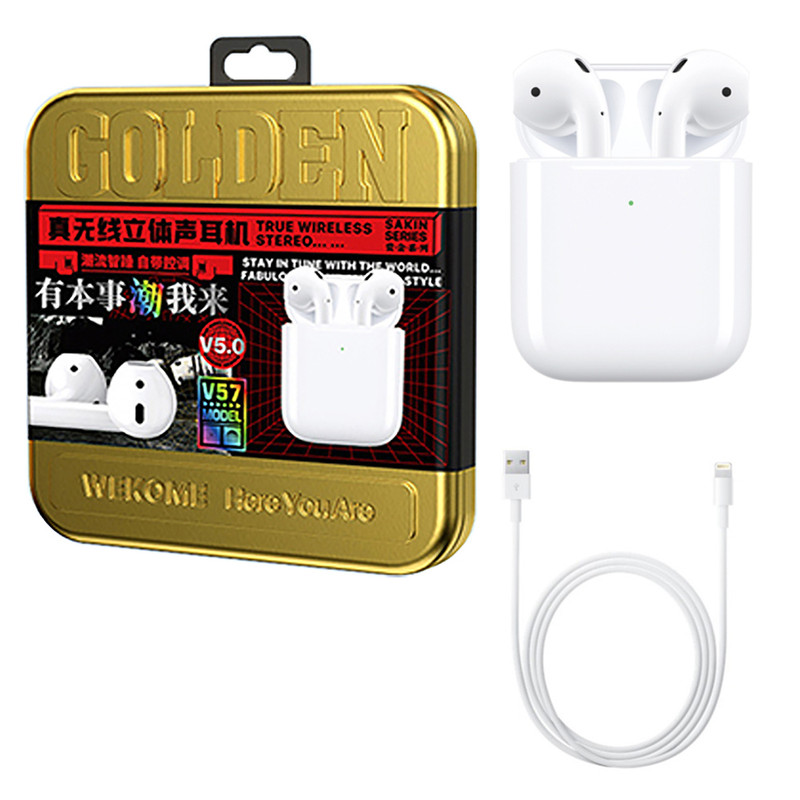 هندزفری بلوتوث مدل V57 برند WEKOME یک هندزفری بسیار توانمند از زیر مجموعه های برند محبوب Remax می باشد. طراحی و ساخت این هندزفری به لحاظ ظاهری کاملا مشابه به ایرپاد 2 اپل می باشد. این هندزفری با کیفیت از بلوتوث ورژن 5 استفاده می کند. باتری داخلی هندزفری از نوع لیتیوم با ظرفیت 25 میلی آمپر و باتری داخلی کیس شارژ آن دارای ظرفیت قابل توجه 300 میلی آمپر می باشد که میتواند میزان زمان مناسبی برای نگهداری شارژ برای کاربر فراهم کند. کیس شارژ هندزفری "ویکام" از طریق کابل USB - Lightening که داخل بسته بندی آن نیز قرار دارد قابل شارژ می باشد.