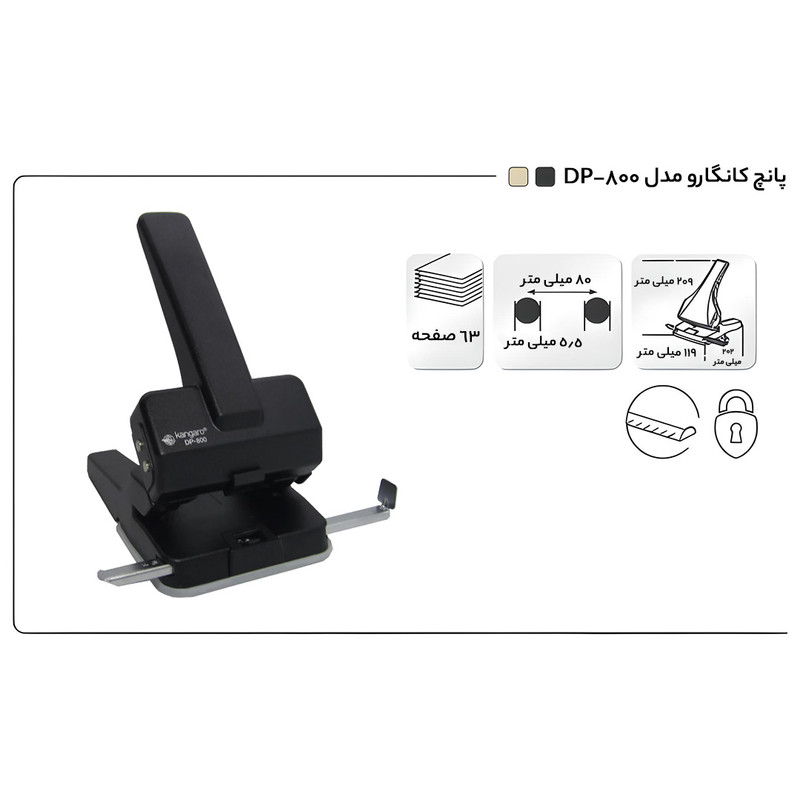 | سایر توضیحات | طول ناحیه پانچ یا فاصله بین دو سوراخ پانچ 80 میلی متر قابلیت سوراخ کردن 60 ورق کاغذ به صورت همزمان قطر سوراخ پانچ 63 میلی متر دارای زبانه فلزی تنظیم محل قرارگیری کاغذ جهت جانمایی محل سوراخ دارای سینی پلاستیکی جهت جمعآوری باقیماندههای کاغذ بدنه فلزی |