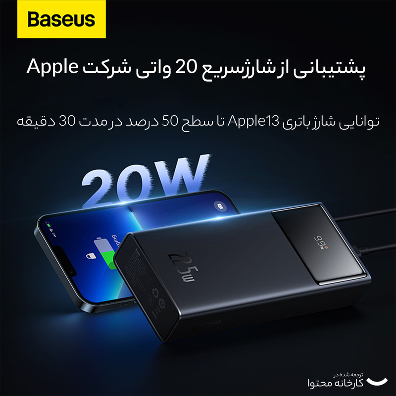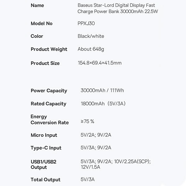 حداکثر توان خروجی پاوربانک Baseus PPXJ060001 برابر 22.5 وات است. توان ورودی و خروجی پورتهای پاوربانک PPXJ060001 به شرح زیر است.
