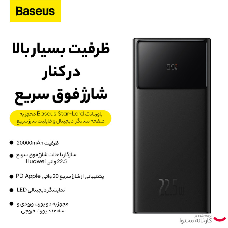پاوربانک ها به وسیله ای تبدیل شده اند که همیشه و همه جا همراه کاربران هستند و این امر باعث شده تا هر روزه پاوربانک هایی با ظاهر و قابلیتهای جدید به بازار عرضه شوند. پاوربانک Baseus Star-Lord PPXJ060001 دارای ظرفیت اسمی 20000 میلی آمپر ساعت و حداکثر توان خروجی 22.5 وات یکی از پاوربانکهای جدید شرکت بیسوس است.