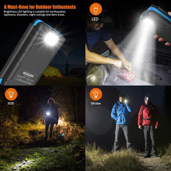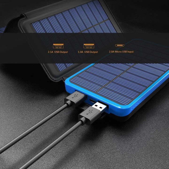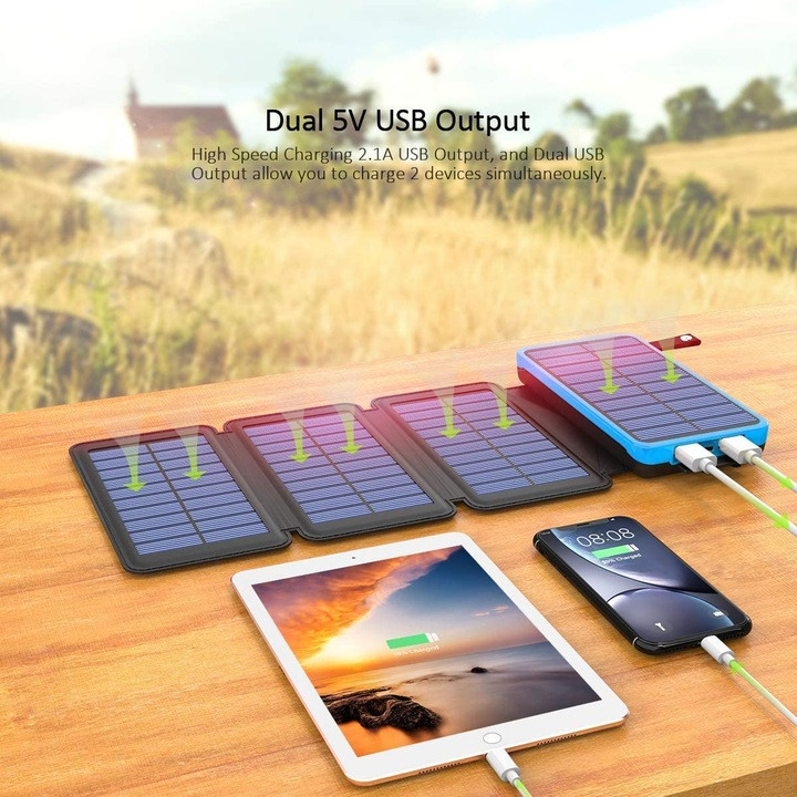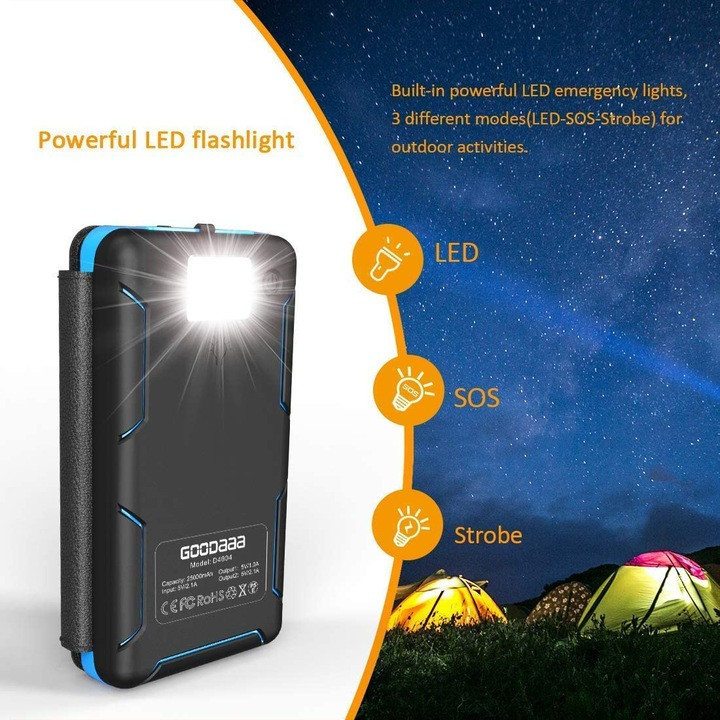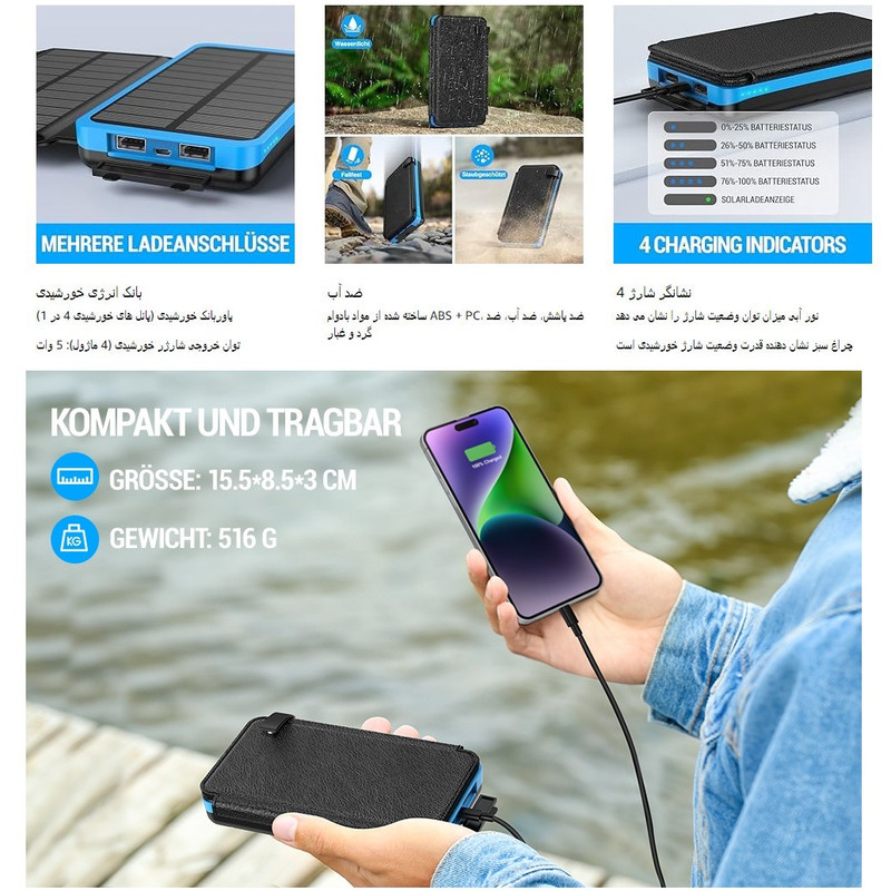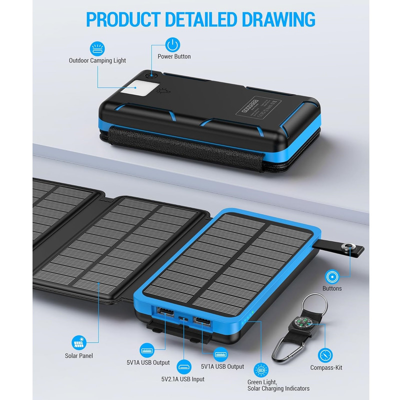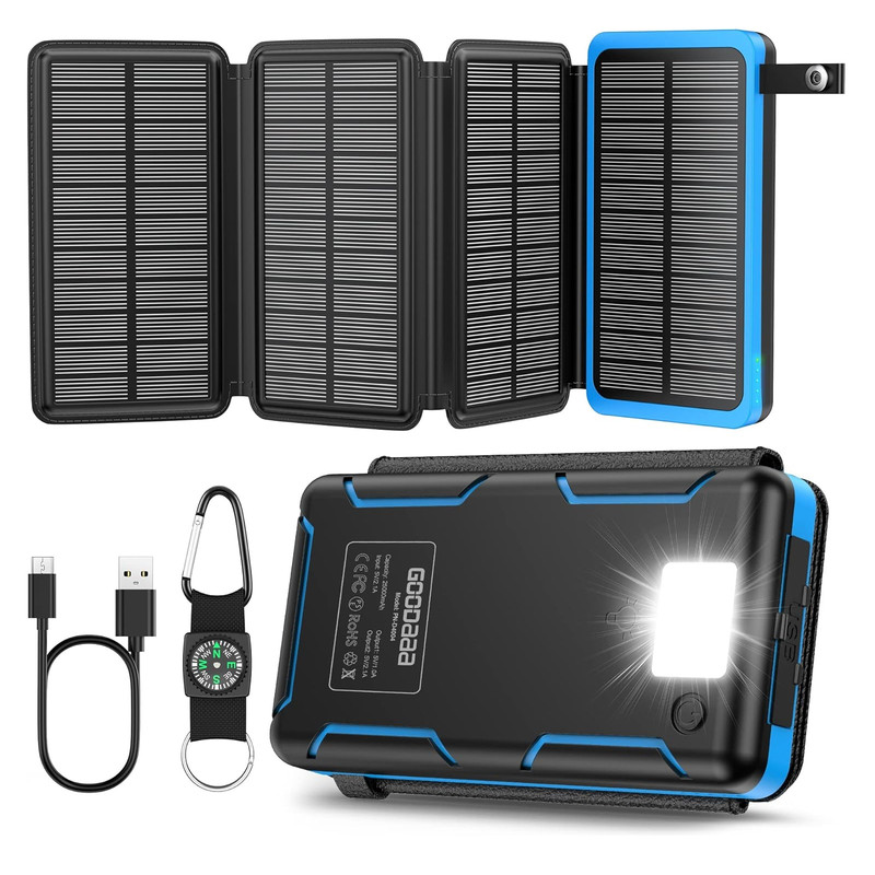 | مشخصات فنی | طراحی بادوام و مستحکم، تلفن هوشمند شما را حتی در مکانهای بدون برق کار میکند. طراحی تاشو همچنین امکان حمل و نقل در کوله پشتی و در حین حرکت را فراهم می کند. دو درگاه USB به طور کامل امکان شارژ همزمان دو دستگاه را می دهد و در نتیجه زمان شارژ را به میزان قابل توجهی کاهش می دهد. پاوربانک فضای باز: یک لامپ کمپینگ روشن نیز در پاوربانک تعبیه شده است. پاوربانک خورشیدی GOODaaa ابزاری کاربردی برای کمپینگ، پیاده روی، ماهیگیری، مسافرت و سایر فعالیت های در فضای باز است. |