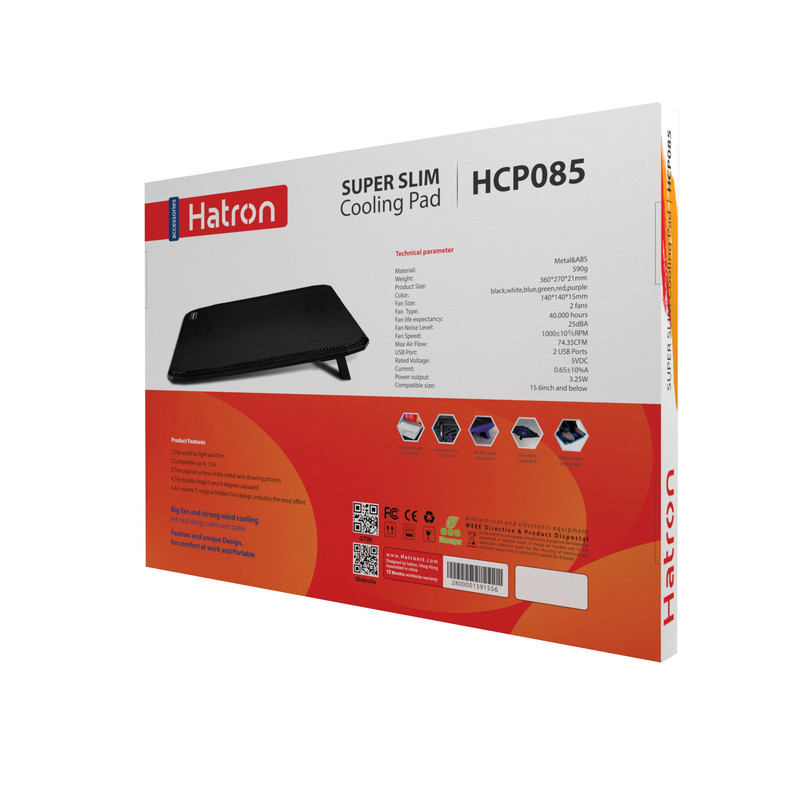 برند Hatron یکی از بهترین تولیدکنندگان لوازم جانبی کامپیوتر و لپتاپ در ایران است. پایه خنککننده لپتاپ هترون مدل HCP085 دارای 2 عدد فن خنککننده با سرعت گردش فن 1000±10% دور در دقیقه است. بدنه ساخته شده از جنس ABS و فلز این مدل، مقاومت در برابر فشار و آسیبهای احتمالی را تضمین میکند. همچنین امکان تنظیم ارتفاع از طریق پایه تعبیه شده تا 2 سطح مختلف وجود دارد. بهرهمندی از 2 پورت USB با قابلیت انتقال دیتا محدودیتهای استفاده از پورتهای لپتاپ را جبران میکند. HCP085 مناسب برای انواع لپتاپها با سایز تا 17 اینچ است و با تعبیه چراغ LED روی فن و نورپردازی داخلی جلوه بصری زیبایی ایجاد کرده است. این مدل دارای یک عدد کابل USB برای اتصال به لپتاپ است و ولتاژ کاری 5 ولتDC، جریان کاری 0٫65±10% آمپر و توان مصرفی 3.25 وات است.