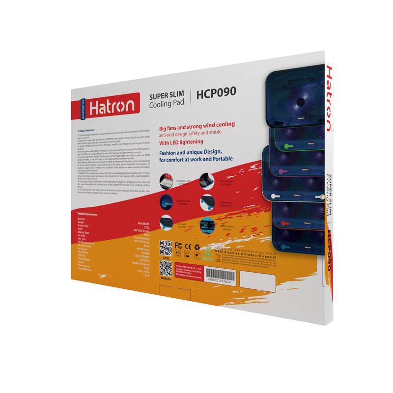 برند Hatron یکی از بهترین تولیدکنندگان لوازم جانبی کامپیوتر و لپتاپ در ایران است. پایه خنککننده لپتاپ هترون مدل HCP090 دارای 2 عدد فن خنککننده با سرعت گردش فن 1000±10% دور در دقیقه است. بدنه ساخته شده از جنس ABS و فلز این مدل، مقاومت در برابر فشار و آسیبهای احتمالی را تضمین میکند. همچنین امکان تنظیم ارتفاع از طریق پایه تعبیه شده تا 2 سطح مختلف وجود دارد. بهرهمندی از 1 پورت USB اضافی با قابلیت انتقال دیتا محدودیتهای استفاده از پورتهای لپتاپ را جبران میکند. HCP090 مناسب برای انواع لپتاپها با سایز تا 15 اینچ است و با تعبیه چراغ LED روی فن و نورپردازی داخلی جلوه بصری زیبایی ایجاد کرده است. این مدل دارای یک عدد کابل USB و دو لبه نگهدارنده بهمنظور جلوگیری از سرخوردن و افتادن لپتاپ می باشد. ولتاژ کاری 5 ولت DC، جریان کاری 0٫65±10% آمپر و توان مصرفی 3.25 وات است.