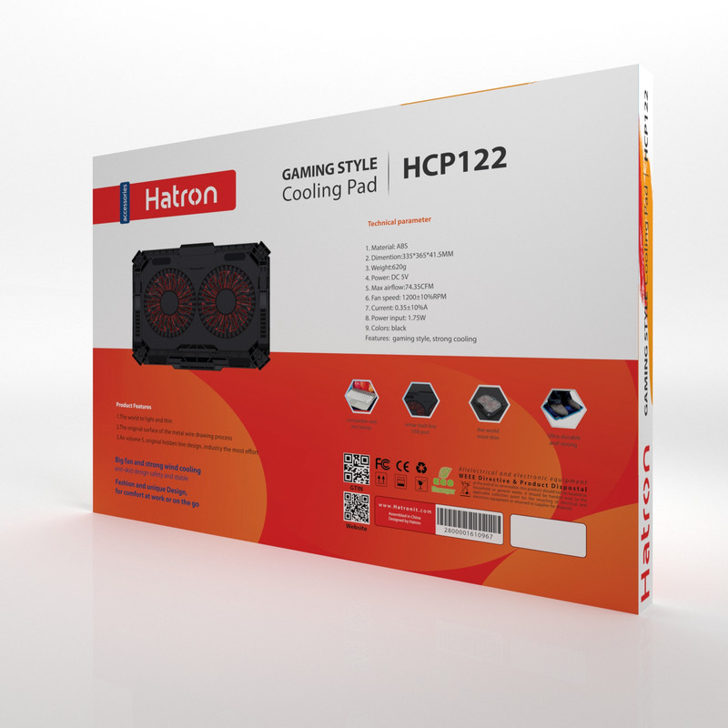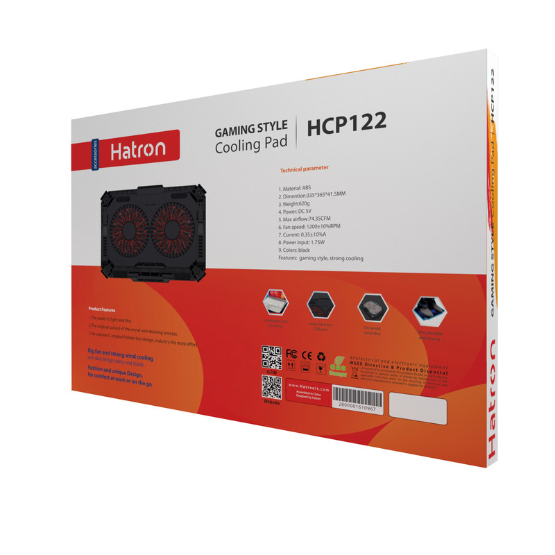 برند Hatron یکی از بهترین تولیدکنندگان لوازم جانبی کامپیوتر و لپتاپ در ایران است. پایه خنککننده لپتاپ هترون مدل HCP122 دارای 2 عدد فن خنککننده با سرعت گردش فن 1100±10% دور در دقیقه است. بدنه ساخته شده از جنس ABS و فلز این مدل، مقاومت در برابر فشار و آسیبهای احتمالی را تضمین میکند. همچنین امکان تنظیم ارتفاع از طریق پایه تعبیه شده در 7 سطح مختلف وجود دارد. بهرهمندی از 2 پورت USB با قابلیت انتقال دیتا محدودیتهای استفاده از پورتهای لپتاپ را جبران میکند. HCP122 مناسب برای انواع لپتاپها با سایز تا 17 اینچ است و با تعبیه چراغ LED روی فن و نورپردازی داخلی جلوه بصری زیبایی ایجاد کرده است. همچنین با استفاده کلید ولوم بر روی بدنه، میتوانید میزان سرعت و تنظیم حالت نوردهی را مطابق باسلیقه خود نور آن را تنظیم کنید. این مدل دارای یک عدد کابل USB و یک لبه نگهدارنده بهمنظور جلوگیری از سرخوردن و افتادن لپتاپ است. ولتاژ کاری 5 ولتDC، جریان کاری 0٫32±10% آمپر و توان مصرفی 1.75 وات است.