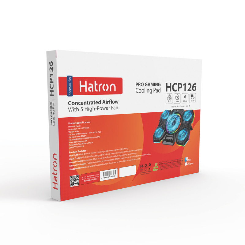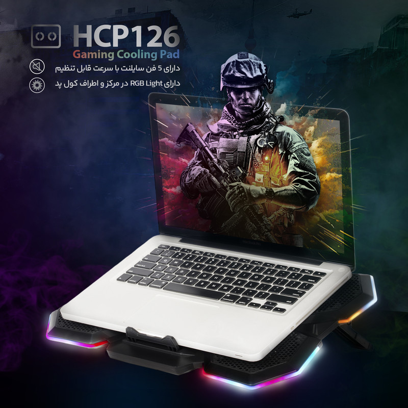 برند Hatron یکی از بهترین تولیدکنندگان لوازم جانبی کامپیوتر و لپتاپ در ایران است. پایه خنککننده لپتاپ هترون مدل HCP126 از جمله مدلهای گیمینگ این برند دارای 5 عدد فن خنککننده بی صدا با سرعت گردش فن 2600±10% RPM/1100±10% RPM دور در دقیقه است گرمای لپ تاپ را تا حد زیادی دفع میکند. بدنه ساخته شده از جنس ABS این مدل، مقاومت در برابر فشار و آسیبهای احتمالی را تضمین میکند. همچنین امکان تنظیم ارتفاع از طریق پایه تعبیه شده در 6 سطح مختلف وجود دارد. بهرهمندی از 2 پورت USB با قابلیت انتقال دیتا محدودیتهای استفاده از پورتهای لپتاپ را جبران میکند. HCP126 مناسب برای انواع لپتاپها با سایز تا 17 اینچ است و با تعبیه چراغ های RGB قرار گرفته در کناره ها در هنگام بازی و کار یک فضای دلنشین و رنگارنگ را ایجاد می کنند. همچنین می توانید هر زمان که نیاز دارید مدل آنها را تغییر دهید و یا خاموش کنید. در این مدل با استفاده از یک سوئیچ بر روی بدنه آن میتوانید میزان سرعت فنهای در حال کار را تغییر داد و در عین حال با یک کلید مجزا حالت نوردهی را مطابق با سلیقه خودتان تنظیم کنید. این مدل دارای یک عدد کابل USB، لبه(پایه) نگهدارنده بهمنظور جلوگیری از سرخوردن و افتادن لپتاپ است. ولتاژ کاری 5 ولت DC، جریان کاری 1±10% آمپر و توان مصرفی 5 وات است. این کولپد مناسب برای لپتاپهای گیمینگ نیز می باشد.