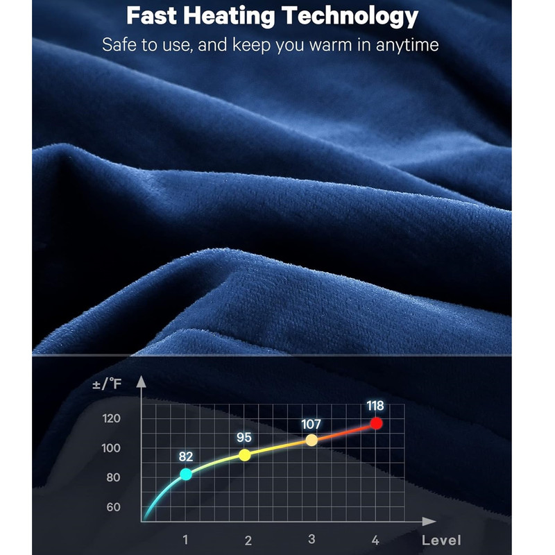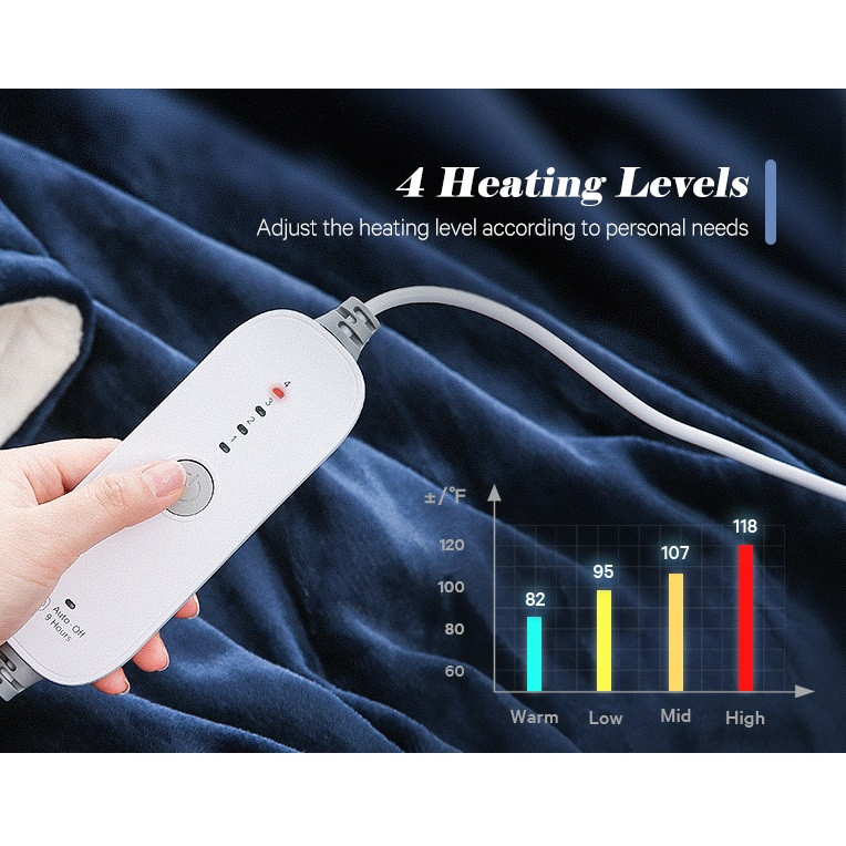 پتو گرمایش 4 سطح گرمایش (82 درجه فارنهایت تا 118 درجه فارنهایت) را فراهم می کند تا کاربران بتوانند دمای مورد نظر را مطابق با ترجیحات خود تنظیم کنند. توصیه می شود هنگام شروع استفاده، سطح گرمایش را روی بالاترین سطح تنظیم کنید تا سرعت گرمایش افزایش یابد و در مدت زمان کوتاهی گرم شود.