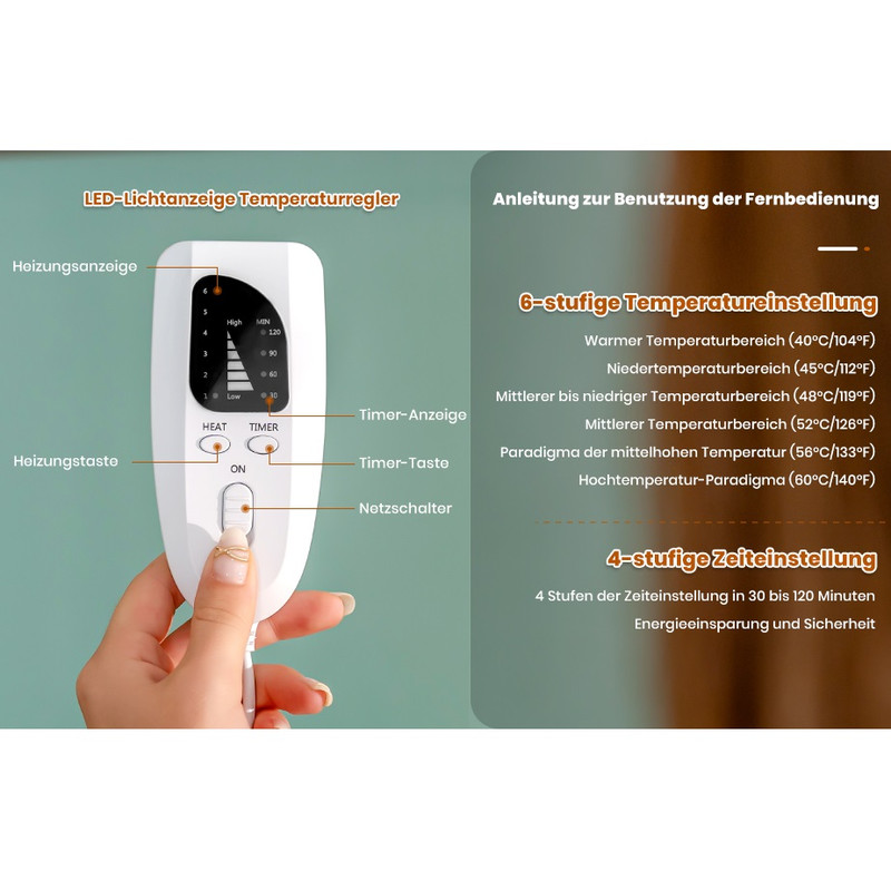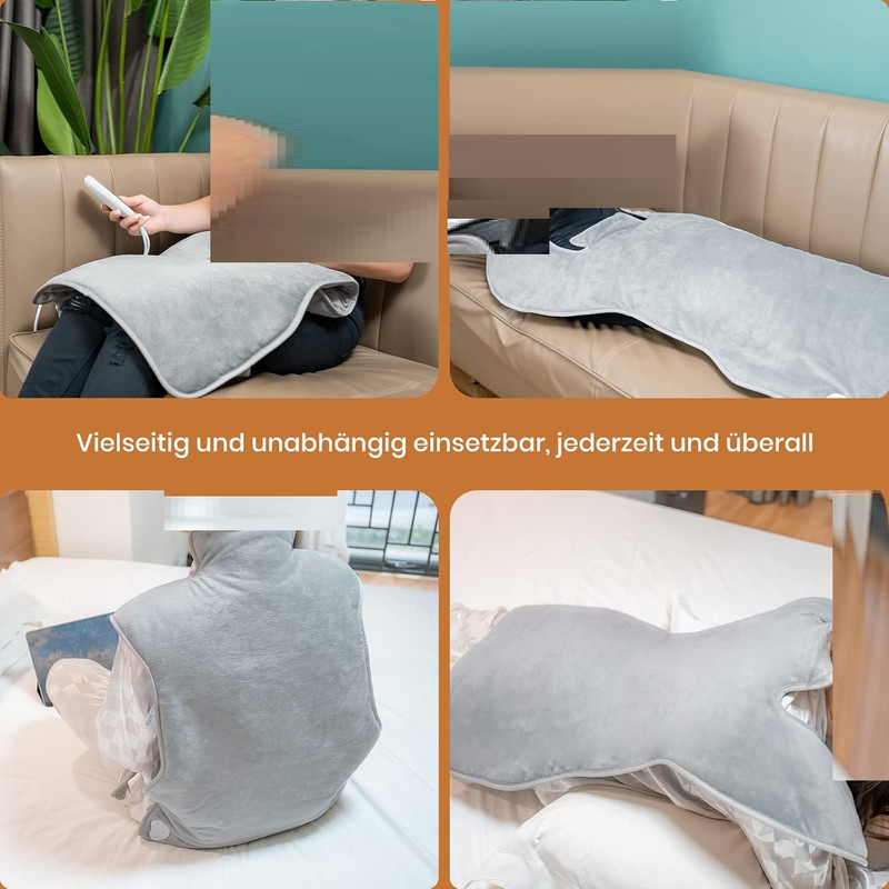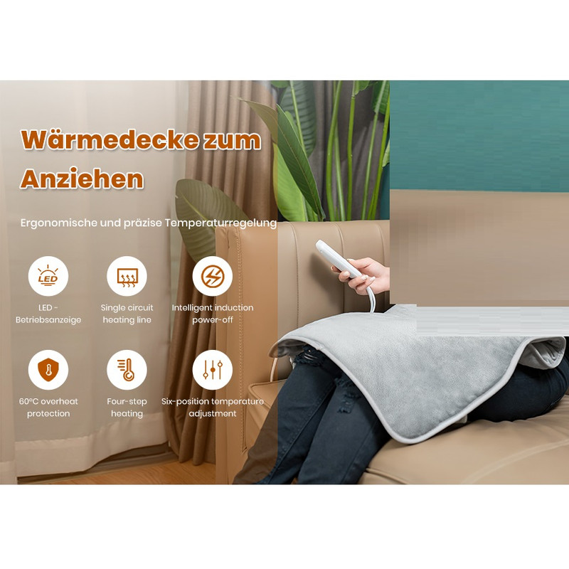 نرم و راحت: با وجود سطح گرمایش بزرگ، به لطف رویه پارچه‌ای پشمی، گرمایش تمام بدن ما به طور ویژه قابل تنفس است. یک محافظ گرمای بیش از حد داخلی نیز دما را کنترل می‌کند و پتوی حرارتی را به موقع خاموش می‌کند. یک محافظ گرمای بیش از حد داخلی نیز دما را کنترل می‌کند. می‌توان از آن در اتاق نشیمن، اتاق خواب و دفتر کار که منبع تغذیه در دسترس است استفاده کرد.