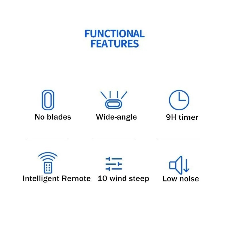 سایر مشخصاتویژگی‌های ایمنی : بدون تیغه، ایمنی در برابر واژگونی، دارای کنترل از راه دور، دارای 9 سطح سرعت ، سطح نویز: <55 دسی‌بل (عملکرد بی‌صدا) ،بهره‌وری انرژی بالا ، درجه انرژی کارآمد : A+ ،قدرت خنک کننده: ۳۵ وات (خنک‌کننده)