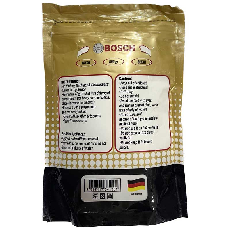 توضیحات و مشخصات پودر جرم گیر ماشین ظرفشویی و لباسشویی بوش 500 گرمی