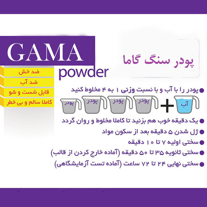 پودر سنگ گاما بسیار مقاوم با خاصیت ضد آب بودن و قابلیت ششتشو و نشکن بودن بهترین پودر سنگ هنری موجود در بازار است که از این پودر سنگ می توان انواع ظروف سنگی، گیفت های عروسی و تولد، مجسمه سازی، قالبگیری دست و پا، سنگ نما ،روشویی و....... استفاده کرده