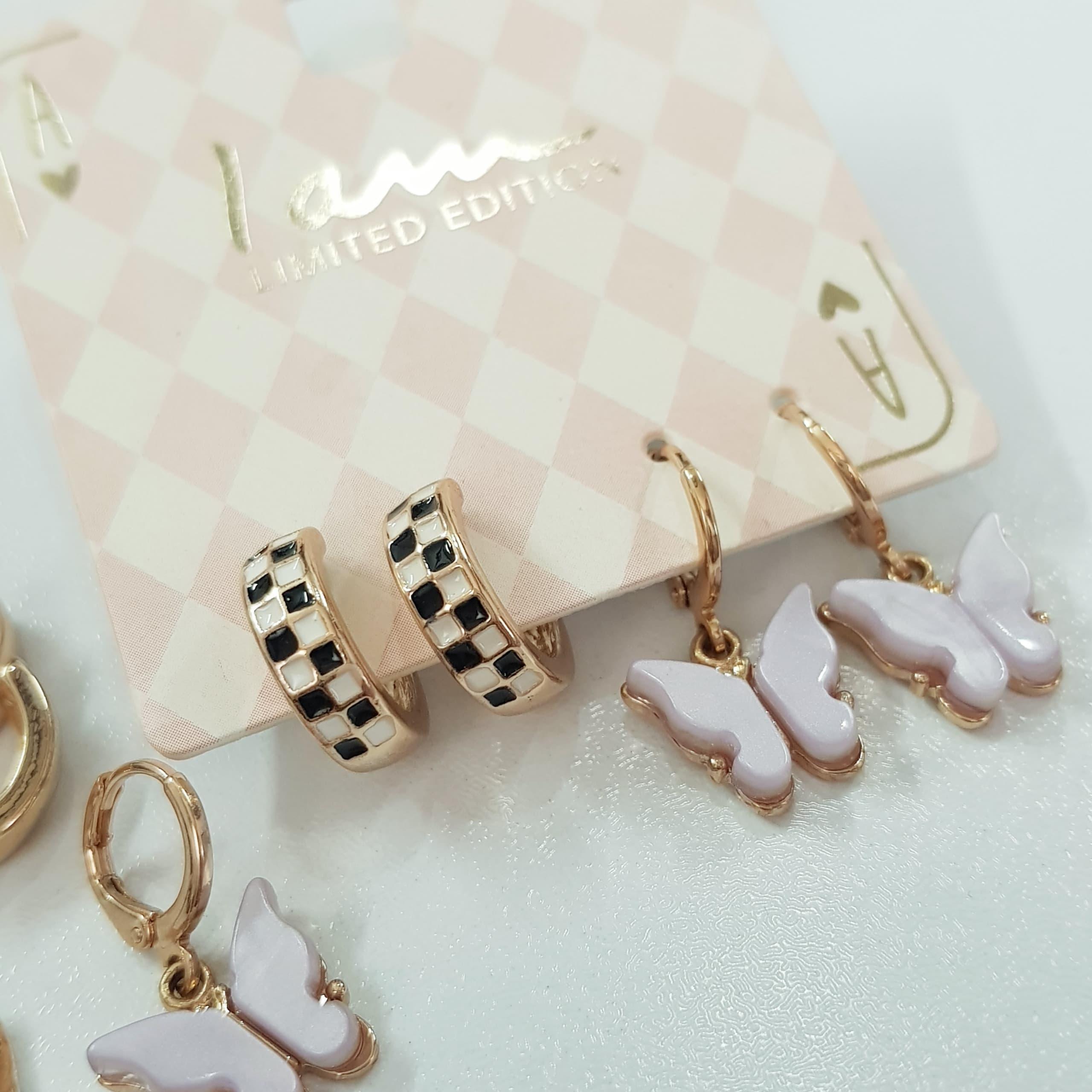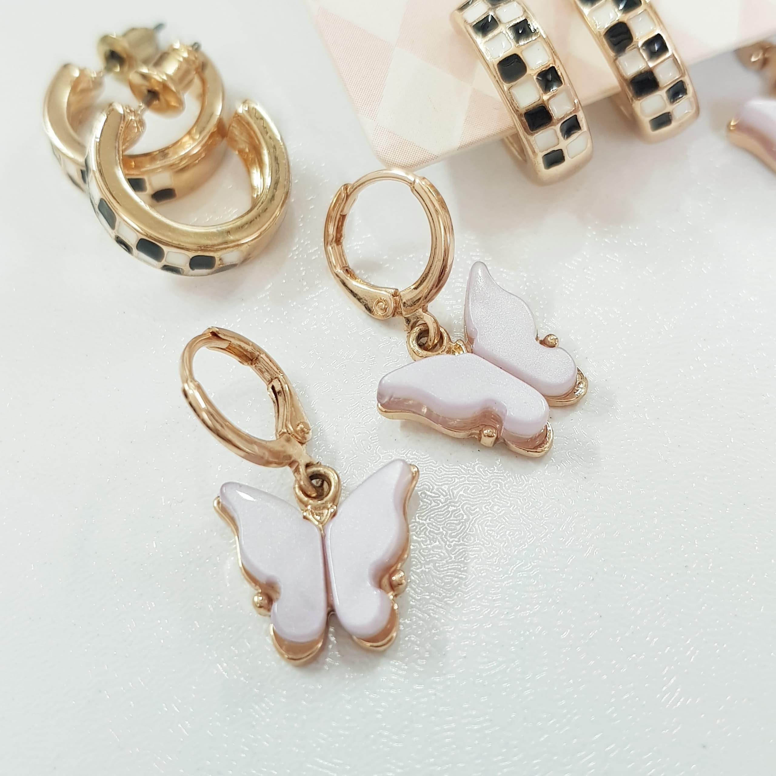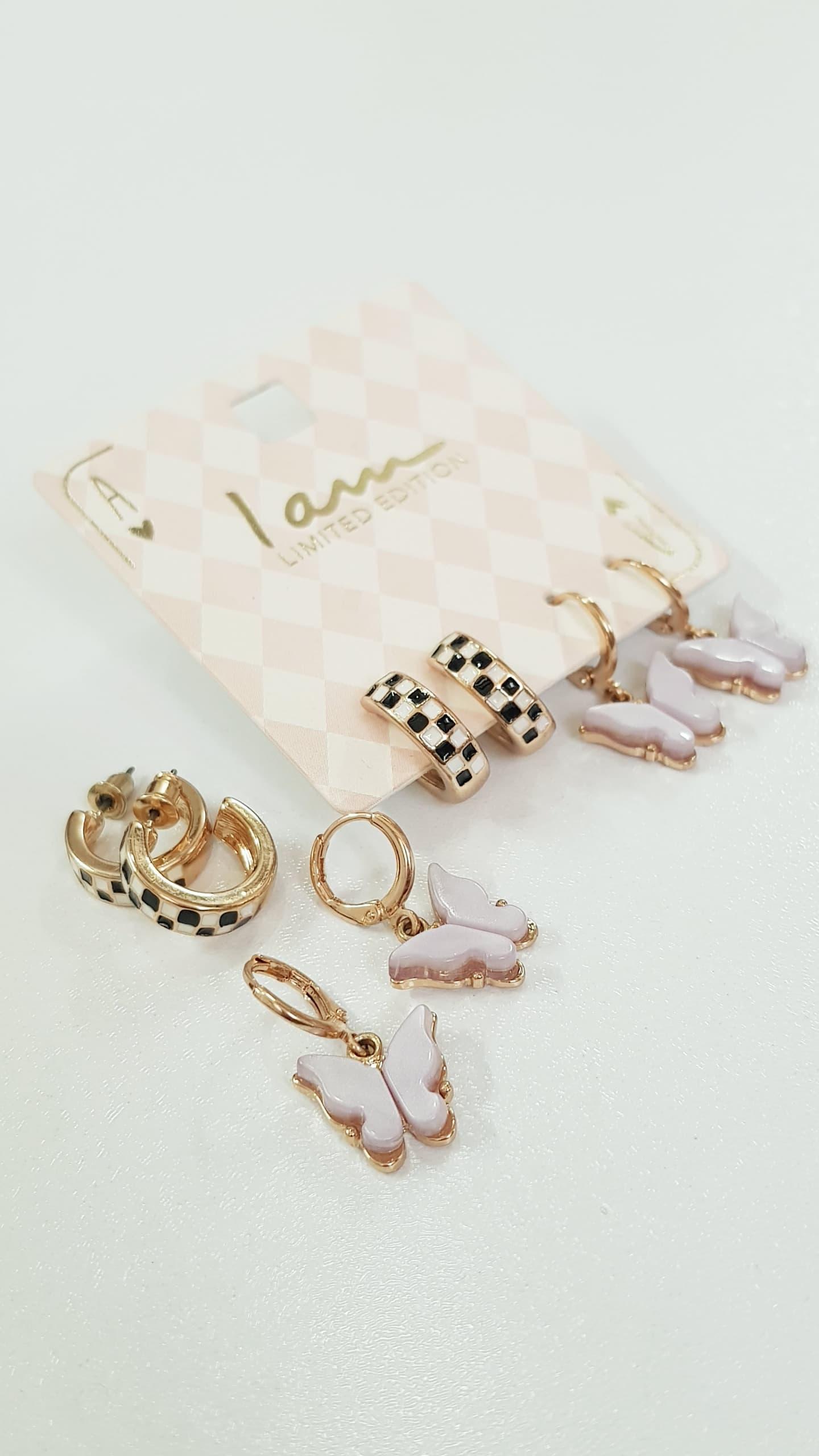 پک گوشواره قفلی طلایی آویز پروانه و گوشواره حلقه طلایی شطرنجی ، کار فوق العاده زیبا و با کیفیت از سری لیمیتد ادیشن iam رنگ ثابت و ضد حساسیت برند iam تحت لیسانس آمریکا