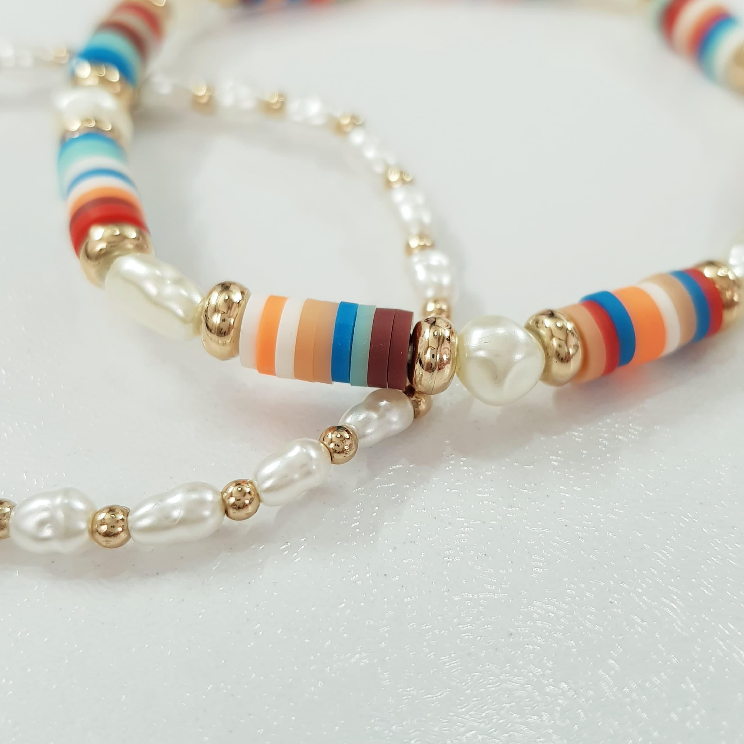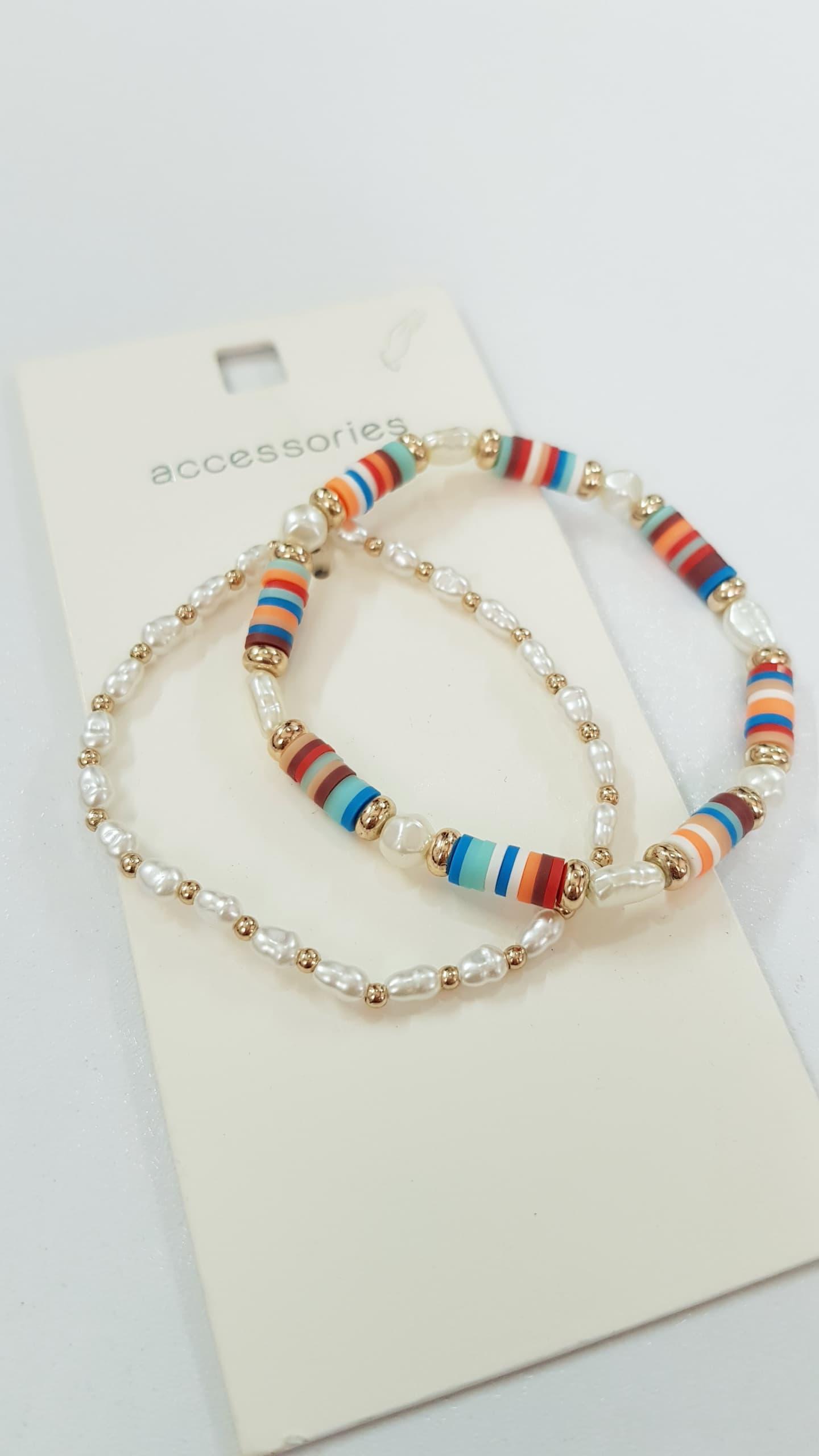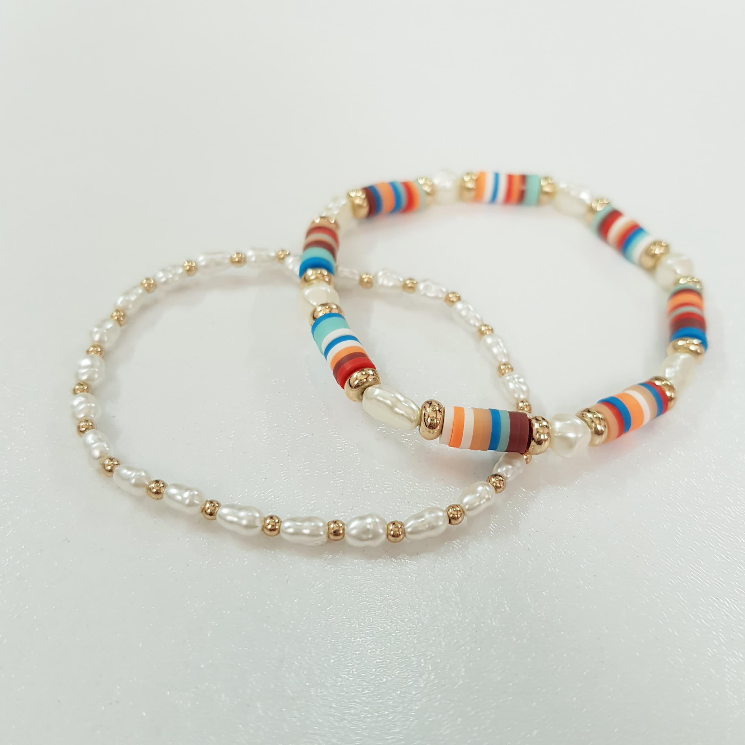 پک دوعددی دستبند کشی کار شده با مروارید و مهره های فیمو رنگی ، فری سایز