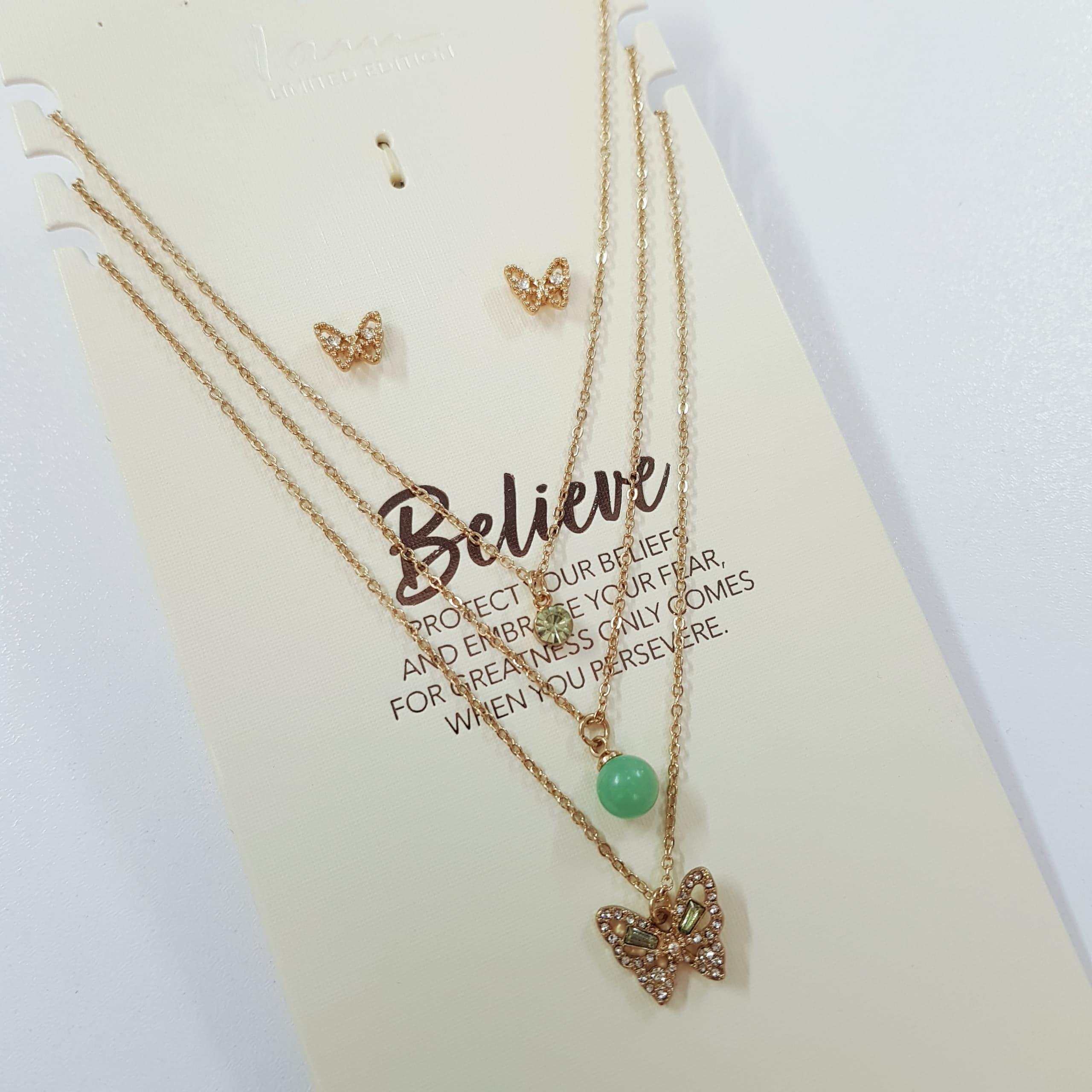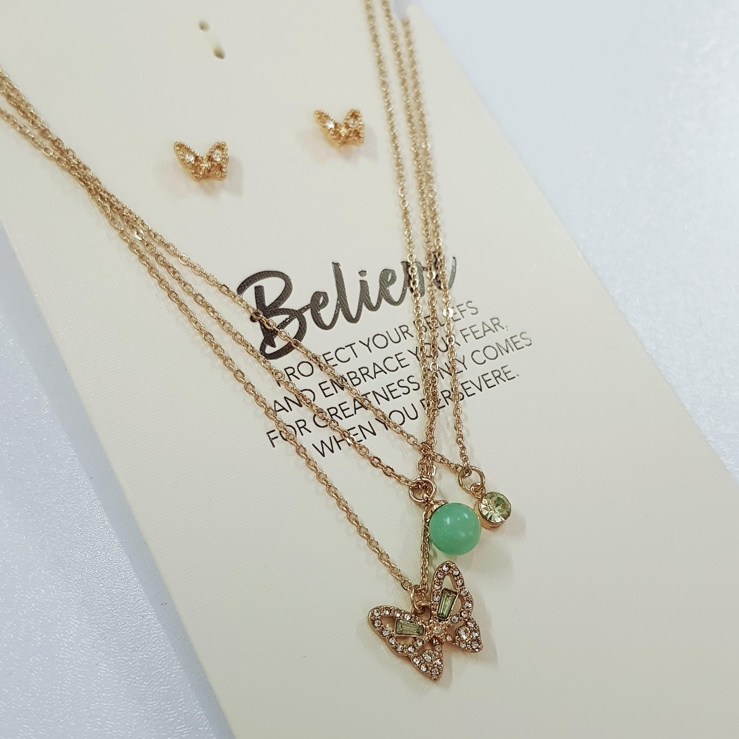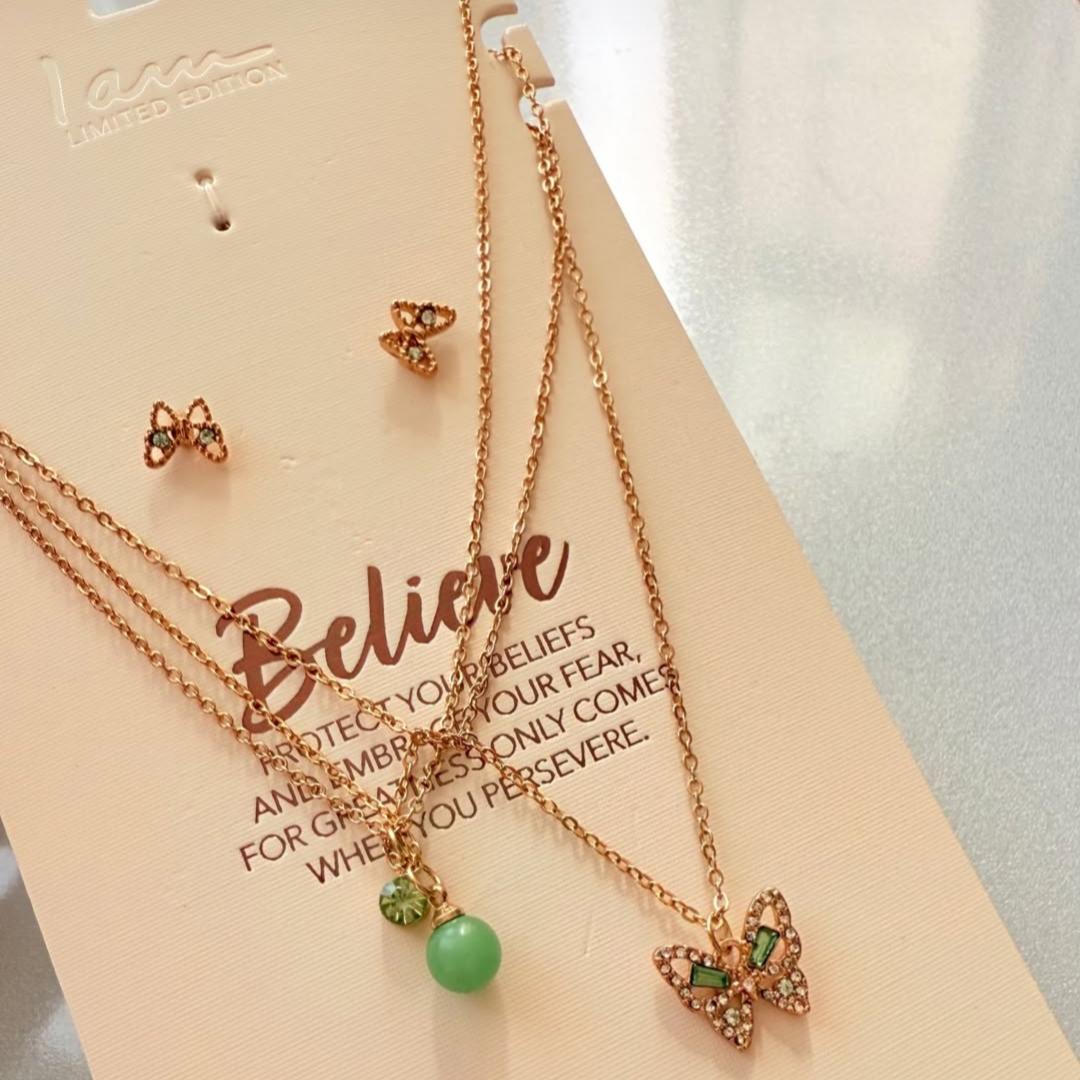 پک سه عددی گردنبند طلایی آویز سنگ آونتورین و گوشواره پروانه ، از سری لیمیتد ادیشن iam کار بسیار ظریف و مینیمال ، دارای سه قفل مجزا ضد حساسیت برند iam تحت لیسانس آمریکا