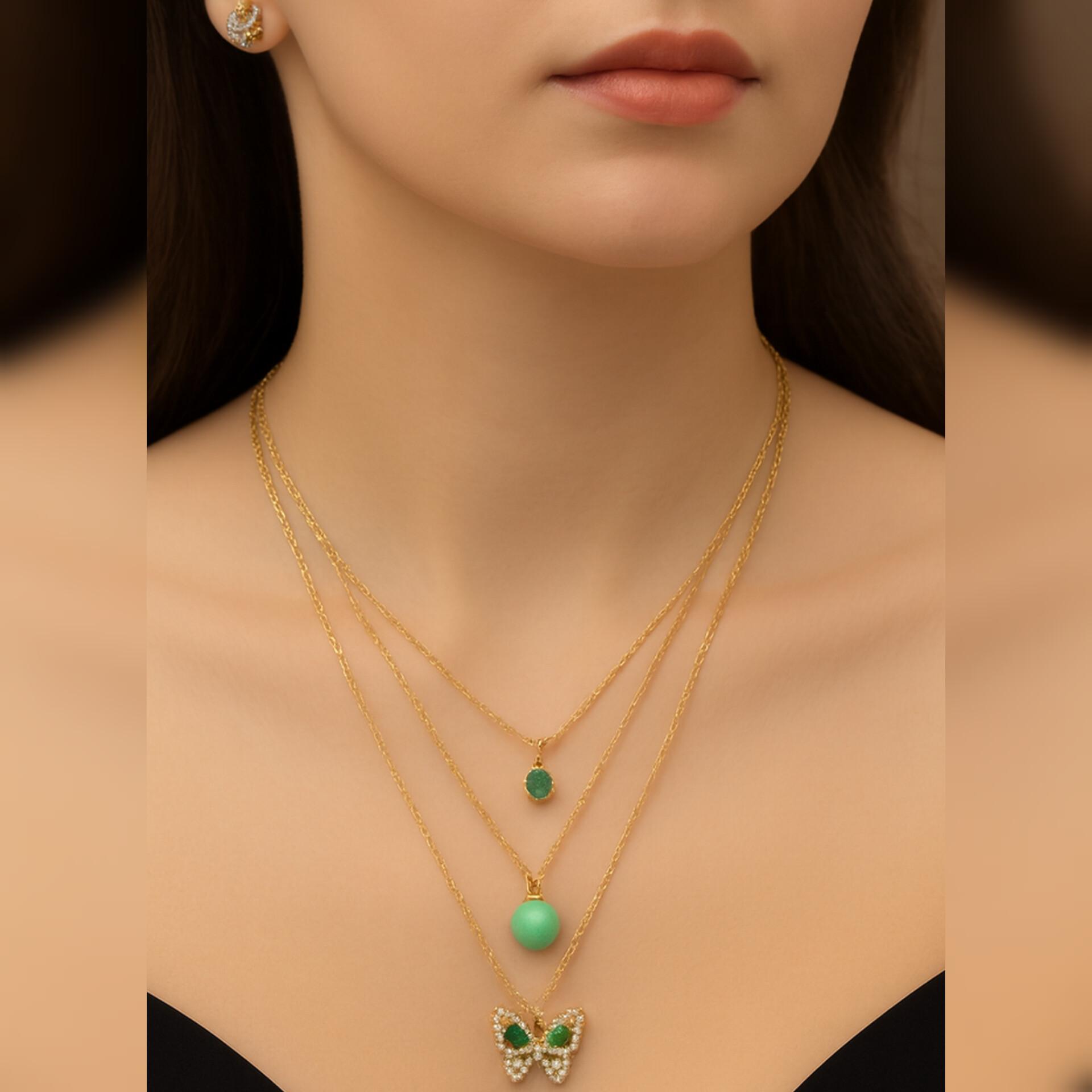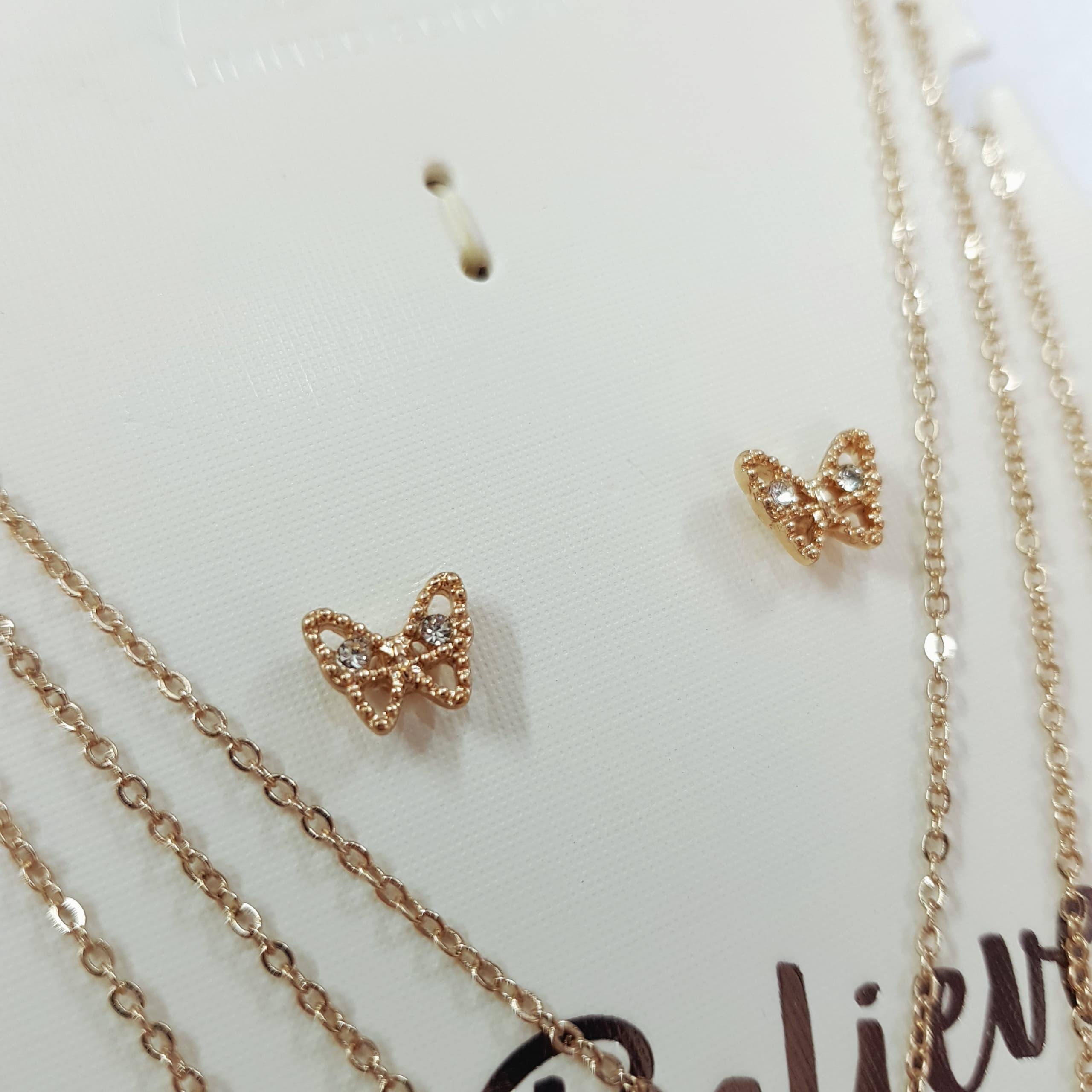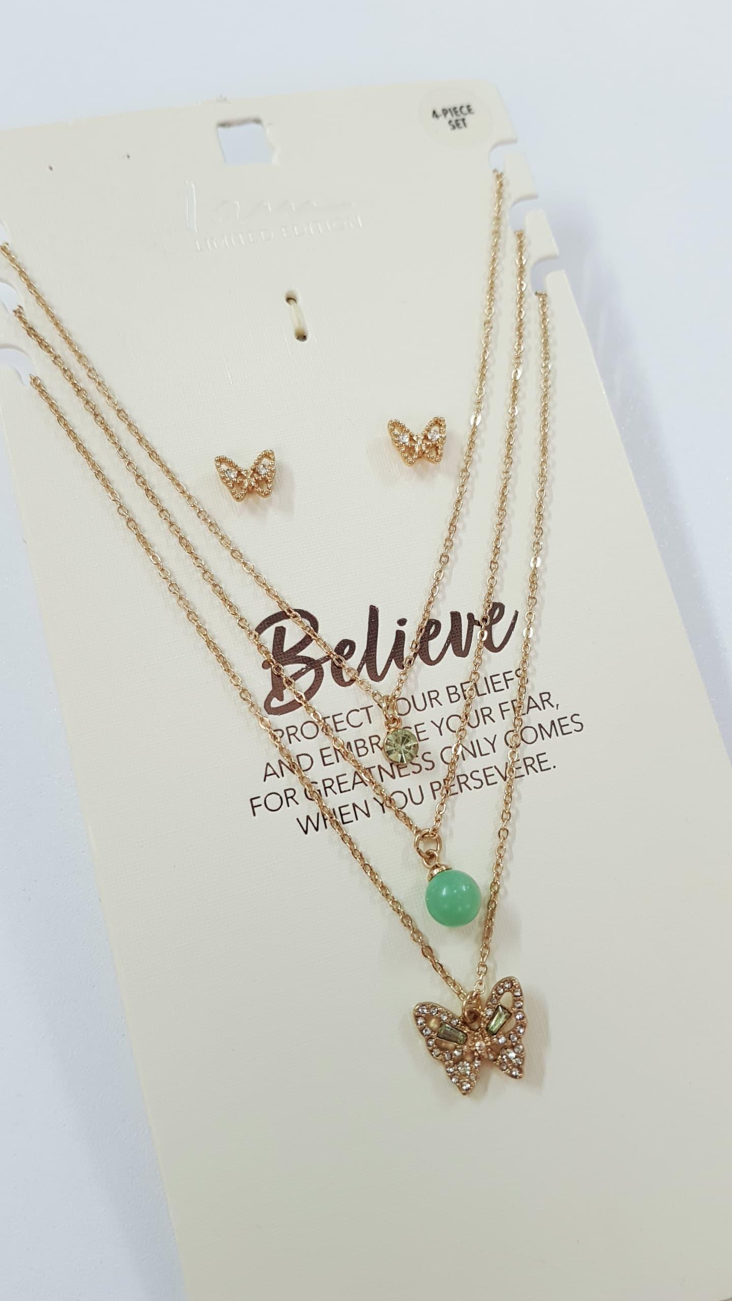 پک سه عددی گردنبند طلایی آویز سنگ آونتورین و گوشواره پروانه ، از سری لیمیتد ادیشن iam کار بسیار ظریف و مینیمال ، دارای سه قفل مجزا ضد حساسیت برند iam تحت لیسانس آمریکا