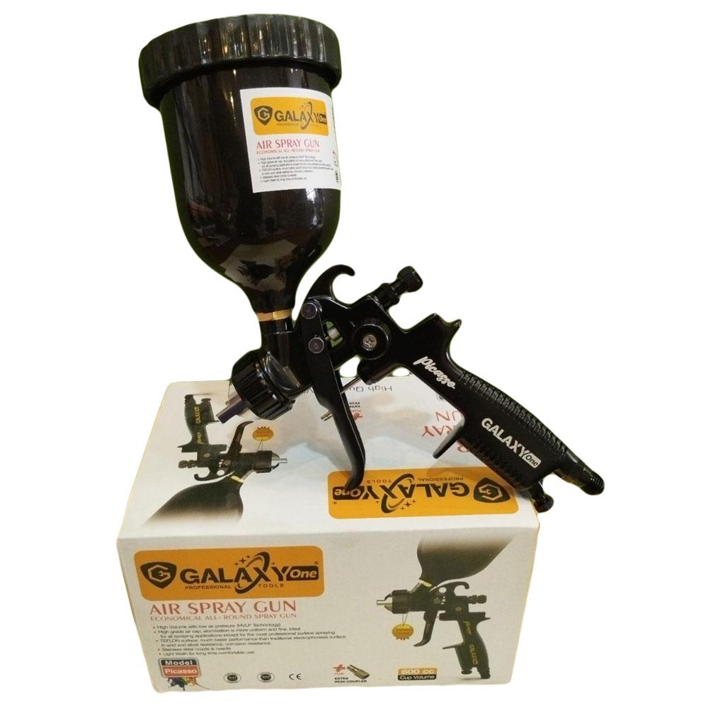 پیستوله رنگپاش بادی حرفه ای گلکسی وان مدل پیکاسو دارای سه پیچ تنظیم (پیچ تنظیم میزان ورودی باد، پیچ تنظیم میزان خروجی رنگ و پیچ تنظیم پهنای پاشش) می باشد. کاسه این پیستوله از جنس پلاستیک با ظرفیت 600 میلی لیتر، سوزن و نازل این پیستوله از جنس استیل ضد زنگ، کلاهک پیستوله از جنس برنج می باشد. به منظور استفاده آسان تر یک عدد کوپلینگ اضافه PF20 در داخل هر جعبه پیستوله قرار داده شده که به راحتی به شلنگ باد فنری متصل می شود. علاوه بر رنگ آمیزی خودرو، از این پیستوله برای رنگ آمیزی ساختمان نیز استفاده میشود نازل تخصصی این مدل پیستوله 1/3 می باشد که نازل تخصصی برای رنگ آمیزی خودرو می باشد کیفیت و خوش دست بودن این پیستوله سبب شده که به یکی از پر طرفدار ترین پیستوله های کشور های همسایه ایران تبدیل شود