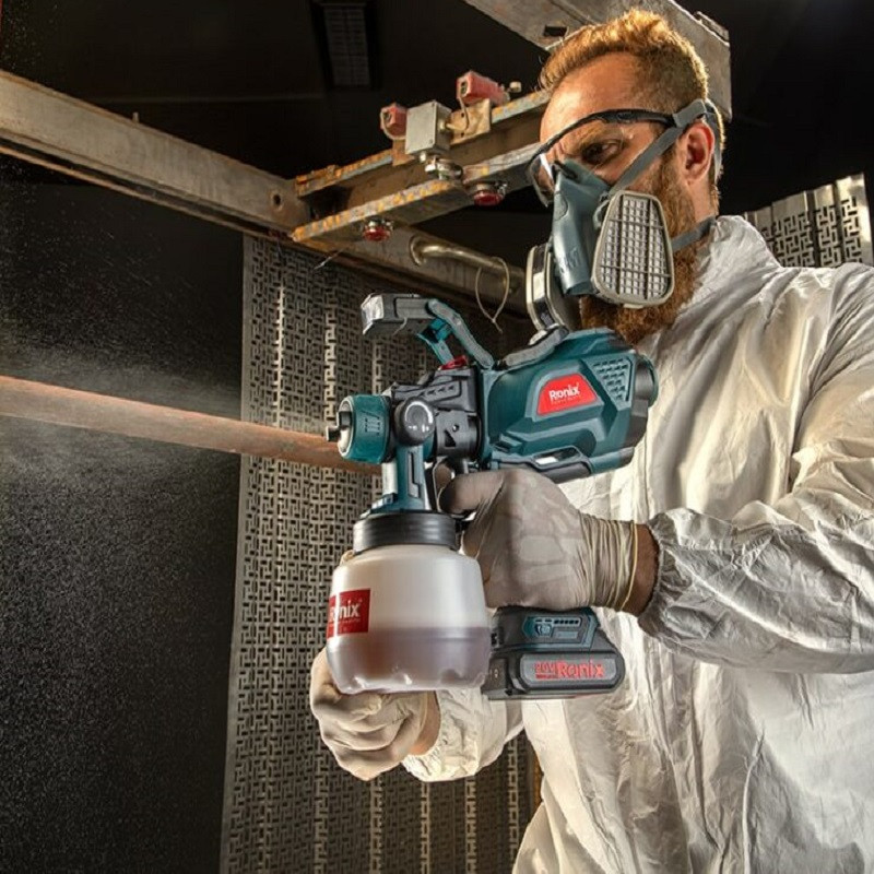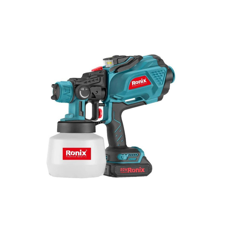 یکی از مهمترین مزایای این پیستوله، شارژی بودن آن است؛ چراکه بدون نیاز به سیم، در مکانهای با دسترسی دشوار و برای پاشش رنگ در سطوح وسیع قابل استفاده است. در پیستوله 8604 رونیکس از باتری 20 ولت لیتیوم-یون با ظرفیت 2000 میلیآمپر ساعت استفاده شده است. این باتری در تمام محصولات All In One سری 86 رونیکس قابل استفاده است؛ بین 18 تا 20 دقیقه کار میکند و حداکثر جریان رنگ 600 میلیلیتر در دقیقه را ایجاد میکند.