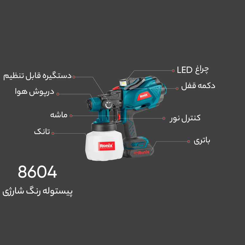 پیستوله رنگپاش شارژی 8604 رونیکس، نسل جدید پیستولههایی است که با مکانیزم حجم بالا- فشار پایین HVLP کار میکند. در این مکانیزم، حجم رنگ زیاد بوده و فشار هوا کم است. بنابراین، ذرات رنگی بیشتری روی سطوح مینشیند و در نتیجه، ضخامت رنگ بیشتر میشود. میتوان با تنظیم نازل از این پیستوله برای رنگکاری و پاشش حرفهای رنگ در جهات مختلف افقی، عمودی و گرد استفاده کرد.