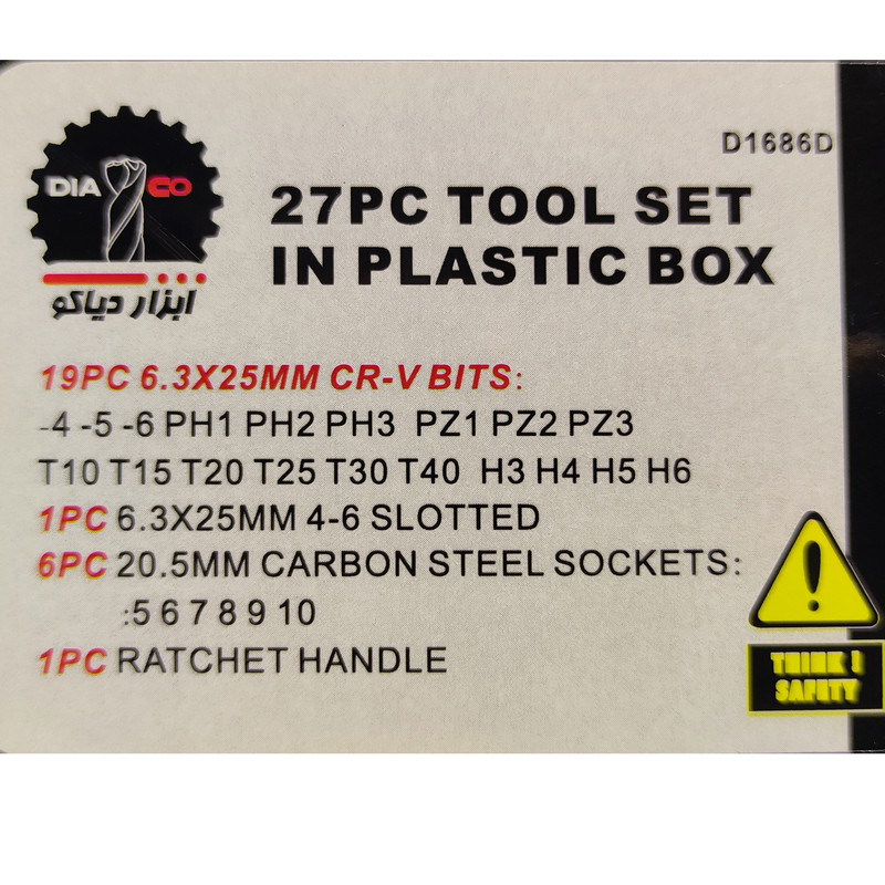 مجموعه 27 عددی پیچ گوشتی و بکس دیاکو ،دارای19 عدد سری پیچ گوشتی و 9 عدد سری بکس با درایو 1/4 اینچ از جنس آلیاژ فولاد کروم- وانادیوم، که مقاومت بالایی در برابر خوردگی، ضربه، پیچش، حرارت و رطوبت دارد همچنین این مجموعه دارای یک عدد پیچ گوشتی جغجغه ای با خاصیت آهنربایی می باشد.