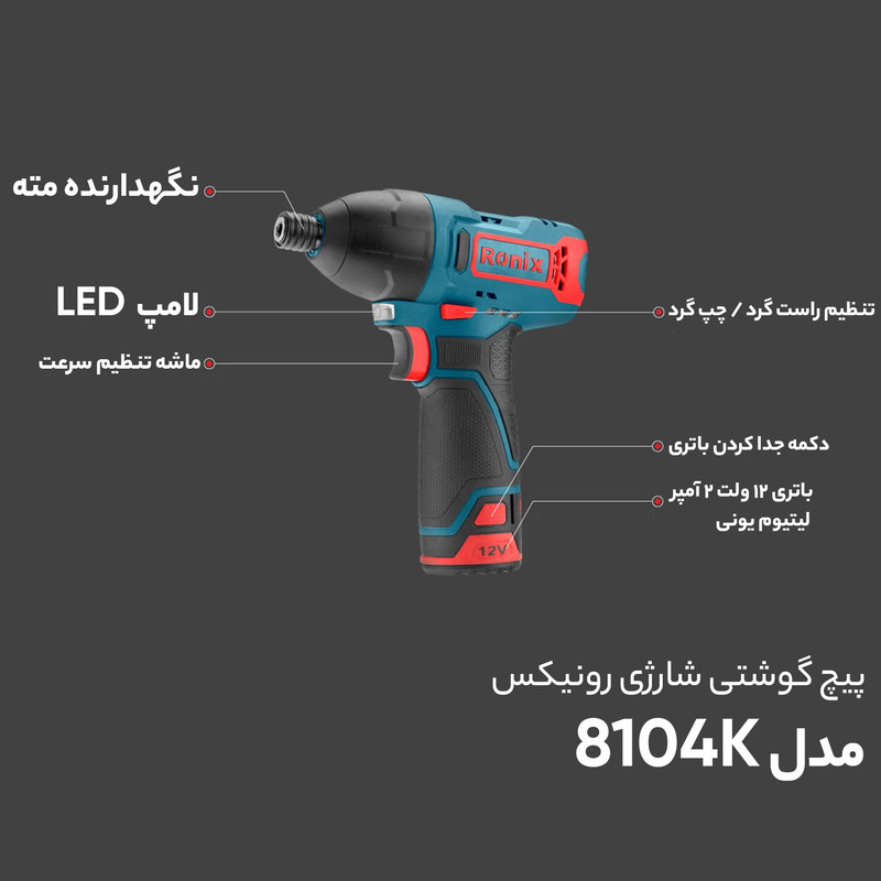 از یک موتور DC 12 ولت باقدرت وراندمان بالا بهره برده است. این موتور سرعتی بالغ بر 2200 دوردر دقیقه تولید می کند که به سه نظام آن منتقل شده وسری پیچ گوشتی هایی تا قطر 1.4 اینچ را به گردش در می آورد. موتوری که گشتاور فوق العاده 120 نیوتن متری را برای این ابزار پرکاربرد به وجود آورده و امکان پیچ کاری در سطوح چوبی و فلزی را برای آن میسر کرده است به علاوه این محصول دارای قابلیت پیچ کاری چکشی نیز هست که برای باز کردن پیچ های قدیمی و خورده شده و بستن پیچ در سطوح متراکم کاربرد دارد. دارای موتوری با کارایی بالا که منبع تغذیه این محصول شارژی یک باتری لیتیوم-یون 12 ولتی با ظرفیت 2 آمپرساعت است. به این معنی که باتری مورد نظر در مدت یک ساعت 2 آمپر جریان الکتریکی برای موتور تامین کرده و انرژی مورد نیاز آن برای حرکت را به وجود می آورد. خود باتری با یک فست شارژر باکیفیت در مدت زمان 50 الی 60 دقیقه از صفر تا صد شارژ می شود و به همین وسیله سرعت فعالیت کاربر را افزایش می دهد. بدنه دارای طراحی منحصربفردی با روکشی از جنس رابر باکیفیت و مقاوم در برابر انواع ضربات احتمالی و سقوط از دست کاربر است که علاوه بر این ضدتعریق و ضدلغزش نیز بوده و از لرزش دستگاه در دست کاربر جلوگیری می کند این بدنه بسیار سبک با حدود 1.64 کیلوگرم وزن، کوچک و با استحکامی فوق العاده است که باعث خستگی کاربر نشده و امکان استفاده در ساعت های طولانی و پرفشار را برای کاربر به وجود می آورد. تنظیم سرعت این پیچ گوشتی توسط یک کلید گازی انجام می گیرد. با فشار انگشت بر کلید گازی اصلی، ابزارگیر دستگاه شروع به حرکت می کند و با دکمه چپگرد و راستگرد جهت حرکت آن مشخص می شود. تمامی کلیدهای تعبیه شده بر بدنه 8104K از نوع کلیدهای ضدغبار باکیفیتی است که با جلوگیری از ورود گردوغبار به داخل دستگاه از استهلاک قطعات داخلی آن جلوگیری می کند و در نتیجه موجب افزایش طول عمر مفید محصول می شود.یک چراغ LED پرنور زیر ابزارگیر محصول تعبیه شده است که نقطه پیچ کاری را در محیط های تاریک روشن می کند تا فعالیت کاربر به دقت انجام گیرد.این دستگاه مجهز به چراغ نشانگر میزان شارژ باتری است.