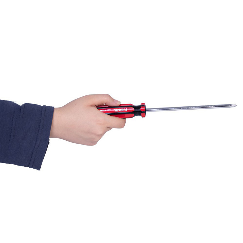 پیچ گوشتی نوا مدل NTS1729، یک پیچ گوشتی چهارسو با سایز سری 6 میلیمتر و میلهای از آلیاژ کروم وانادیوم مرغوب حرارت دهی شده و سخت کاری شده با مقاومت کافی است که برای افزایش دوام به طور کامل پولیش شده و روکش آیینه ای شده است. قسمت انتهایی میله دارای خاصیت مغناطیسی است و طول میله برابر با 150 میلی متر است. سری این پیچ گوشتی به صورت بسیار دقیق و قدرتمند ساخته شده است و دستهی آن به شکل شش گوش طراحی شده تا تحمل ماکزیمم گشتاور را داشته باشد. جنس دسته از متریال سلولزی است و این دسته به صورت بزرگ و ارگونومیک با کارکرد مطلوب طراحی شده است. دسته در برابر ضربه دارای مقاومت خوبی است و طولی برابر با 85 میلیمتر دارد.