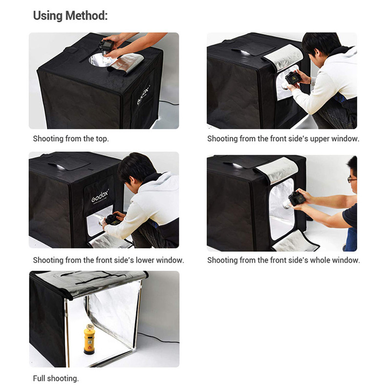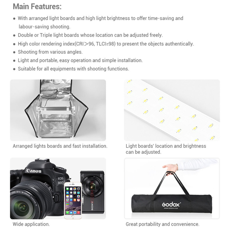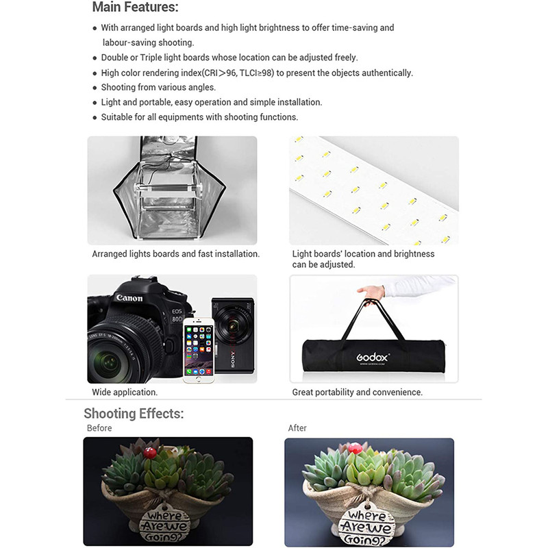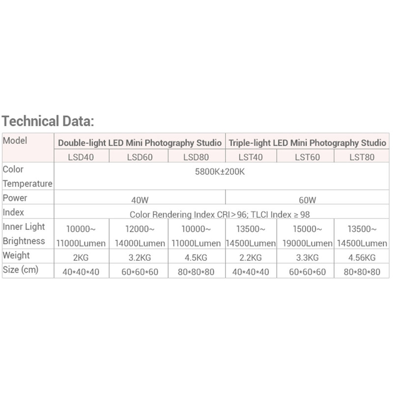 | ویژگی ها | -دارای 3 منبع نور -قابل حمل -مناسب برای عکسبرداری ماکرو و عکاسی محصول و تولید محتوا -مناسب برای ناخن کارها و سالن ارایشی -امکان عکسبرداری از زوایای مختلف -دارای LED ---- سایز 40سانتی متر در 40 سانتی متر |